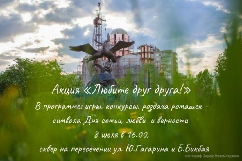 Жителей микрорайона Сипайлово 8 июля ждут в сквере на пересечении улиц Баязита Бикбая и Юрия Гагарина, где «оживет» скульптура танцующих журавлей. В честь всех любящих там состоится праздничное мероприятие «Любите друг друга!». Каждый участник получит в подарок ромашку – символ чистоты и непреходящих семейных ценностей. Для гостей праздника будут организованы веселые игры и конкурсы.
