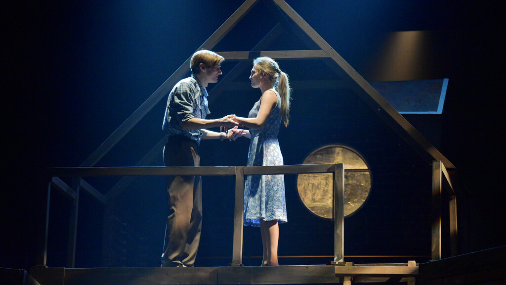 Художник-постановщик Вячеслав Виданов создал удивительной красоты трехэтажный дом, где при помощи вращающегося круга сцены можно оказаться то в одной, то в другой квартире - в самой гуще происходящих в них событий или попасть на чердак, где встречаются влюбленные.