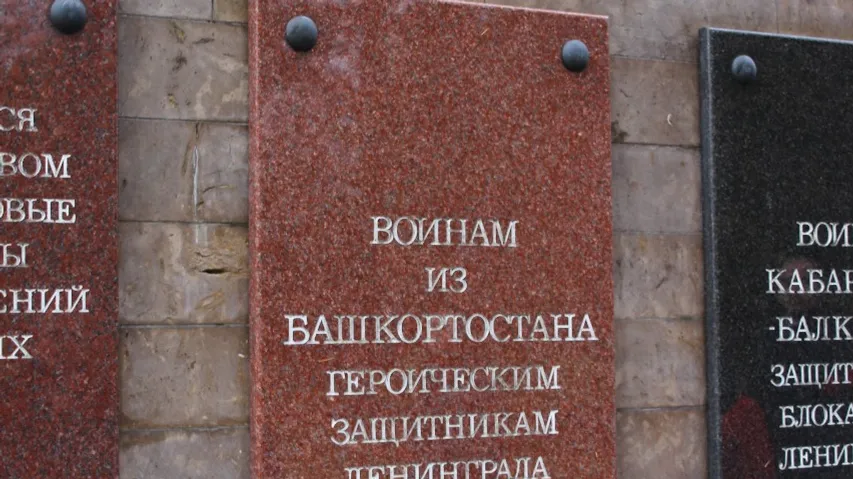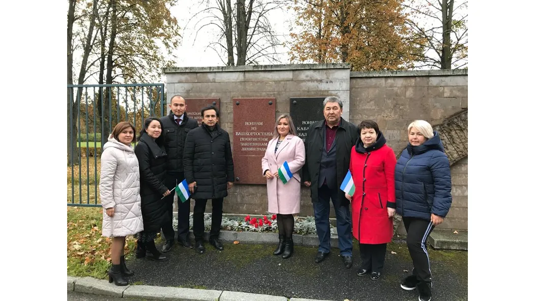 Далее одна группа возложила цветы к памятной плите воинам из Башкортостана, героическим защитникам города Ленинграда на Пискаревском мемориальном комплексе. Памятная плита была установлена 25 января 2002 года.