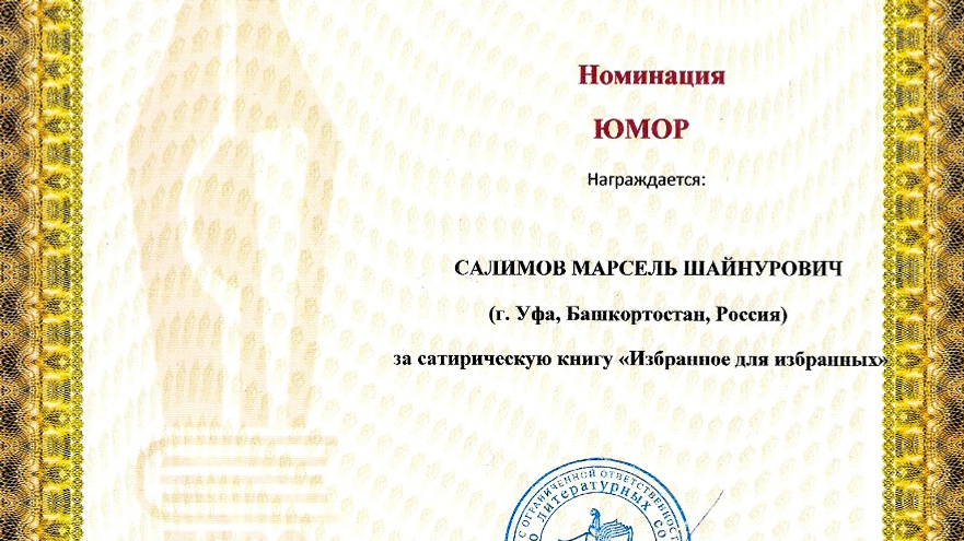 УФА, 29 окт 2019. /ИА «Башинформ»/.В Москве, в Центральном доме литераторов, состоялась торжественная церемония вручения Национальной литературной премии «Золотое перо Руси». В номинации «Юмор» почетного звания «Золотое перо Руси» удостоен башкирский писатель, лауреат международных и российских премий Марсель Салимов за сатирическую книгу «Избранное для избранных».