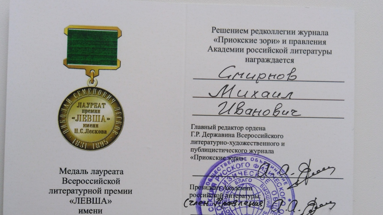 В декабре 2019 года Михаил Смирнов - единственный из писателей Башкортостана - стал лауреатом Всероссийской литературной премии «Левша».