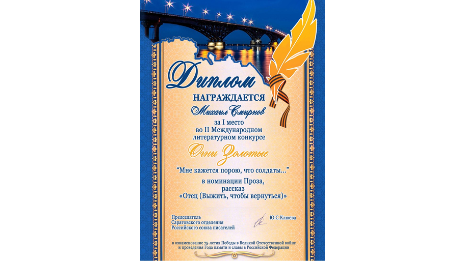 Подведены итоги международного литературного конкурса «Огни золотые». Он был заявлен Саратовским региональным отделением Российского союза писателей при поддержке Министерства культуры Саратовской области и областной библиотеки для детей и юношества им. А.С.Пушкина. Конкурс организован в ознаменование 75-летия Победы в Великой Отечественной войне, проведения Года памяти и славы в Российской Федерации и носил название «Мне кажется порою, что солдаты...».