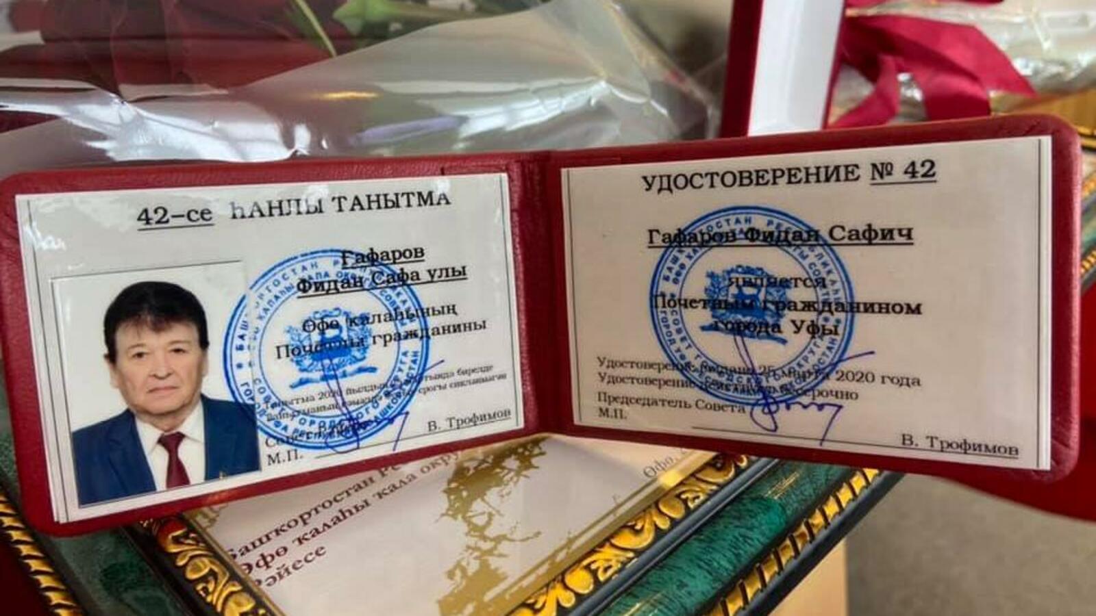 Звезда башкирской театральной сцены и эстрады, популярный актер и исполнитель лирических песен Фидан Гафаров стал почетным гражданином города Уфы, получив удостоверение № 42.