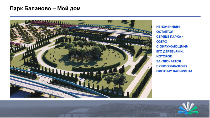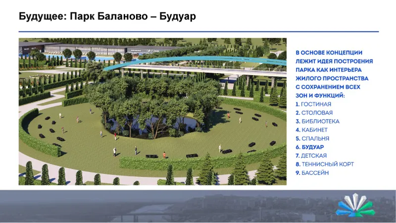 Лесопарк Баланово планируется превратить в комфортное и функциональное пространство. Дизайнер проекта Елена Харичева предложила организовать в парке условные, если обозначить иными определениями, «гостиную», «столовую», «библиотеку», «кабинет», «спальню» и «детскую». Будут здесь также теннисный корт и бассейн. Неизменным, по замыслу проектировщика, должно остаться «сердце» парка - природное озеро. В результате в отдаленном от центра поселке появится современная зона отдыха.