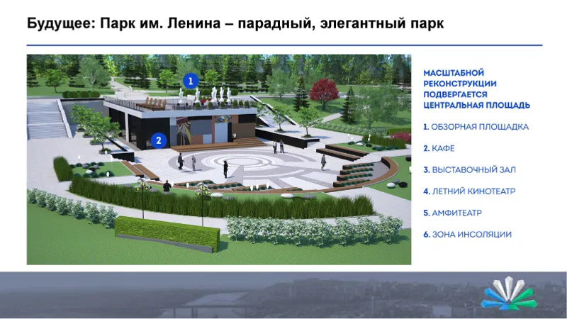Проект реконструкции парка Ленина, расположенного между зданием Башдрамтеатра и Госсобрания-Курултая РБ, представила группа московских дизайнеров. Специалисты считают, что центральная часть парка нуждается в масштабной реконструкции. В результате должны обновиться фонтаны, оборудование которых уже сильно изношено, появятся двухуровневая смотровая площадка с кафе, кинотеатр и детский городок. Зона отдыха будет включать в себя детские и спортивные площадки, а также яблоневый сад. Вход со стороны улицы Заки Валиди предлагается оформить в виде триумфальной арки.