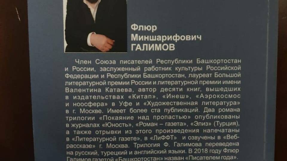 Флюр Галимов — член Союза писателей РБ и РФ, заслуженный работник культуры Российской Федерации и Республики Башкортостан, лауреат Большой литературной премии России и премии имени Валентина Катаева. Роман писателя «Новый башкир» и трилогия «Покаяние над пропастью», ставшие явлением и обогатившие башкирскую литературу новыми темами и новыми героями, получили высокую оценку республиканских критиков и российских литераторов Льва Аннинского, народного писателя Чечни, академика Чеченской Академии наук, лауреата Госпремии РФ в области литературы и искусства, Нобелевского номинанта Канты Ибрагимова и других.
