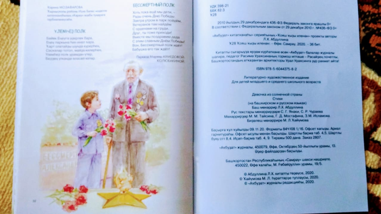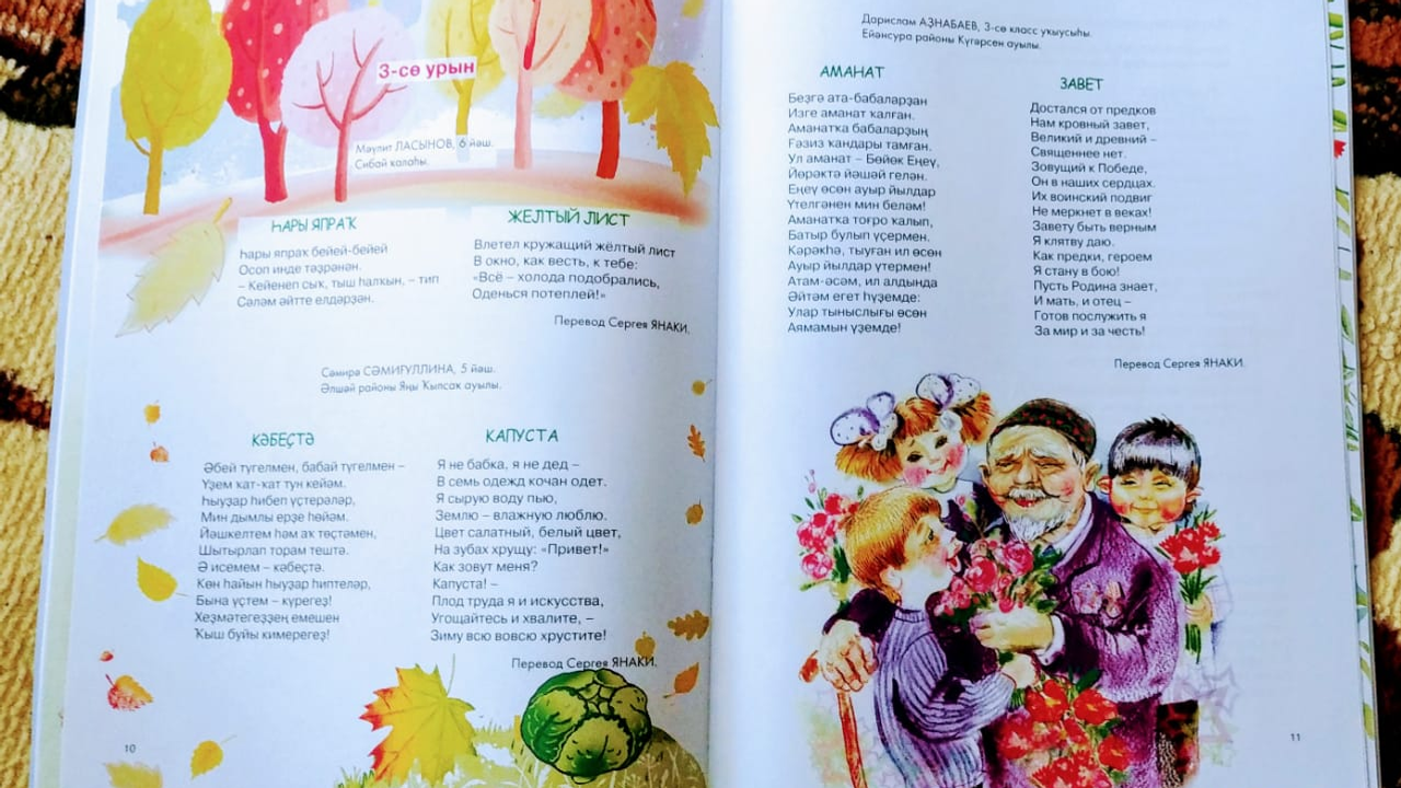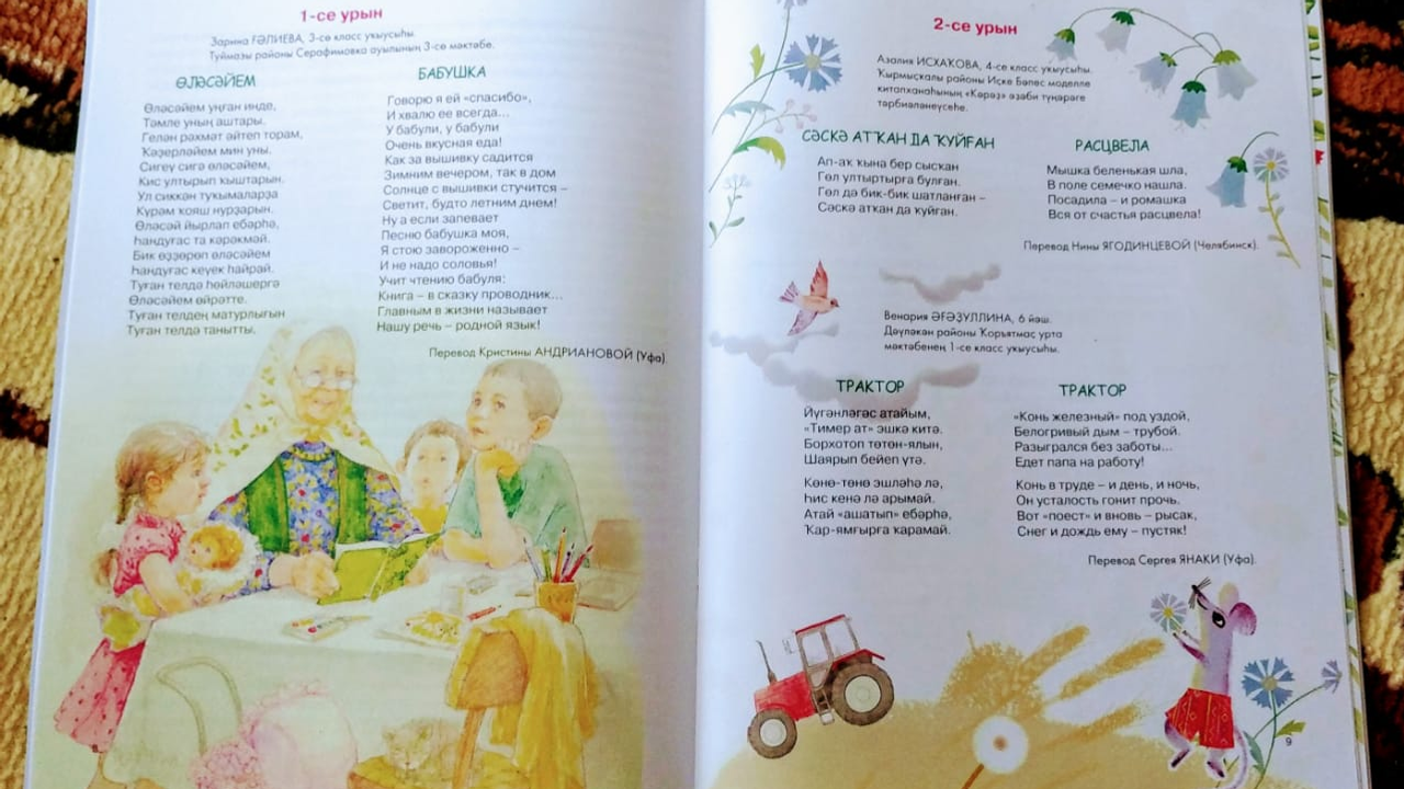 В этом издании стихи малышей и школьников, написанные на башкирском языке, переведены на русский язык. Переводом занимались именитые переводчики России – секретарь Союза Писателей России Нина Ягодинцева, Народный поэт Дагестана Марина Ахмедова-Колюбакина, известные переводчики Башкортостана Сергей Янаки, Светлана Чураева, Кристина Андрианова, участники фестиваля «Корифеи» Юрий Татаренко, Евгения Решетникова.