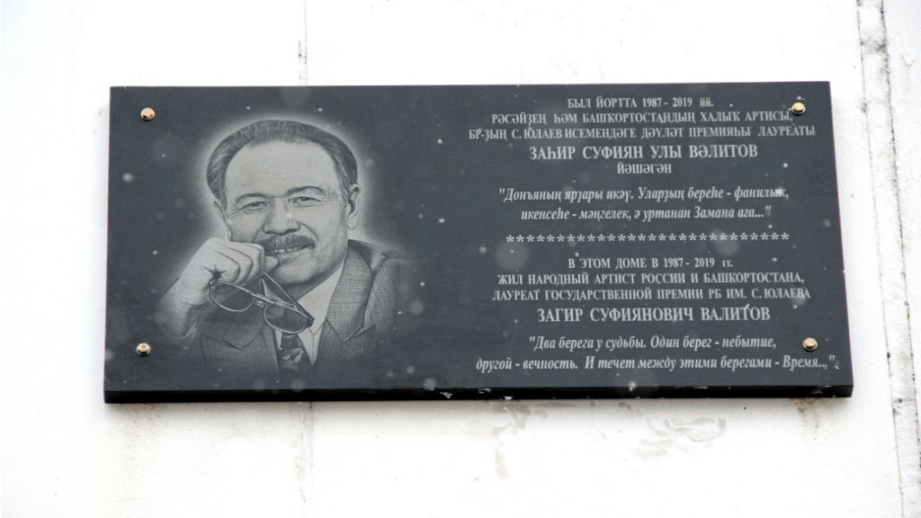 В текст памятной доски вошли строки из автобиографической повести «Долгое-долгое детство» Мустая Карима: «Два берега у судьбы. Один берег - небытие, другой - вечность. И течет между этими берегами Время...». В спектакле по этой книге Загир Валитов играл роль Поэта и за эту роль получил премию имени Салавата Юлаева.