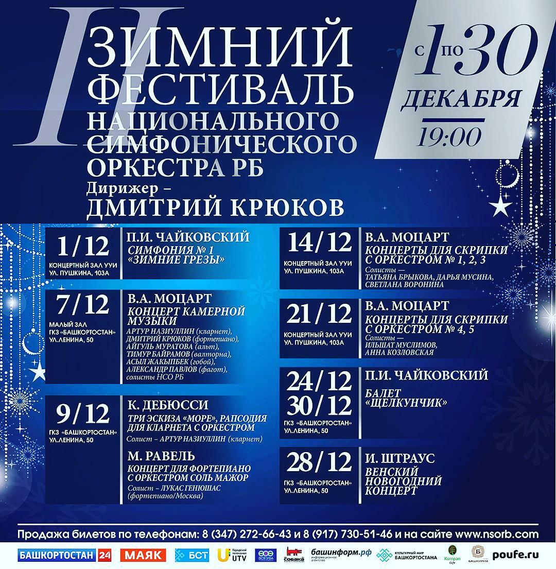 «Наш главный дирижер Дмитрий Крюков скомпоновал очень серьезную и интересную в творческом плане программу. Пятеро скрипачей НСО выйдут и сыграют с коллективом пять концертов Моцарта - это абсолютно беспрецедентная история. Мало какой коллектив может себе такое позволить, - рассказал генеральный директор НСО РБ, заслуженный артист Башкортостана Артур Назиуллин. - Будут и камерные концерты, мне тоже посчастливится выступать на одном из них. 7 декабря в Малом зале ГКЗ я буду со своими коллегами - Айгуль Муратовой и Дмитрием Крюковым - исполнять трио «Кегельштат», также сыграем квинтет Моцарта».Организаторы сообщили, что в преддверии фестиваля была достигнута договоренность с московским пианистом Лукасом Генюшасом. Он будет солировать в Уфе 9 декабря в Большом зале ГКЗ «Башкортостан» на концерте музыки французских импрессионистов Дебюсси и Равеля.