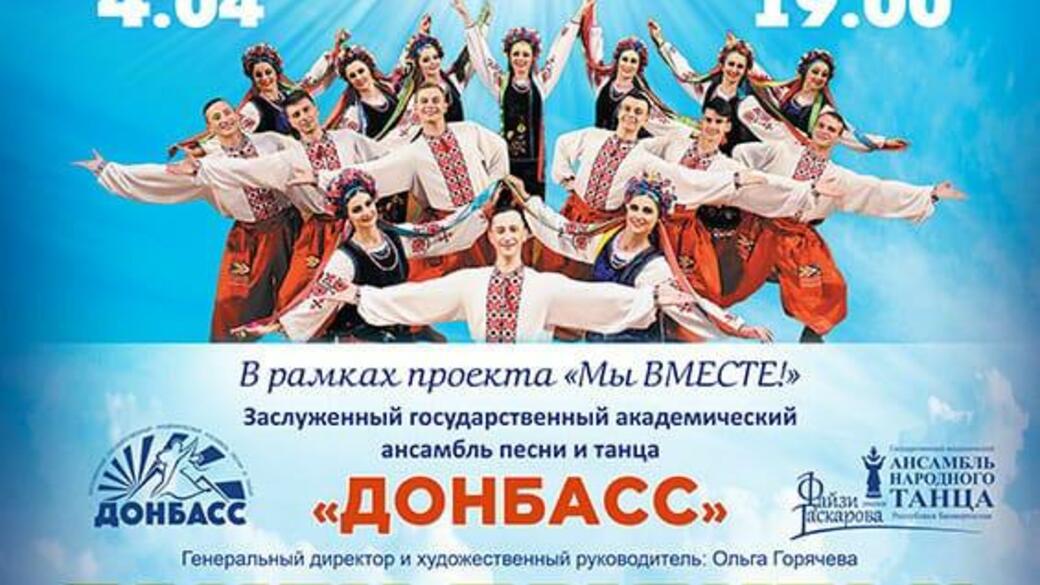 В Уфе 4 апреля в 19.00 в ГКЗ «Башкортостан» в рамках проекта «Мы вместе» состоится совместный концерт Заслуженного государственного академического ансамбля песни и танца «Донбасс» и Государственного академического ансамбля народного танца имени Файзи Гаскарова Республики Башкортостан.