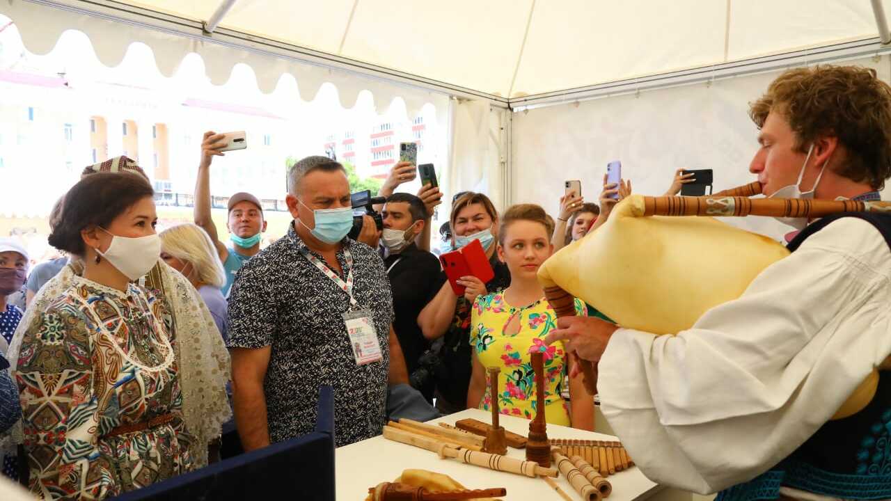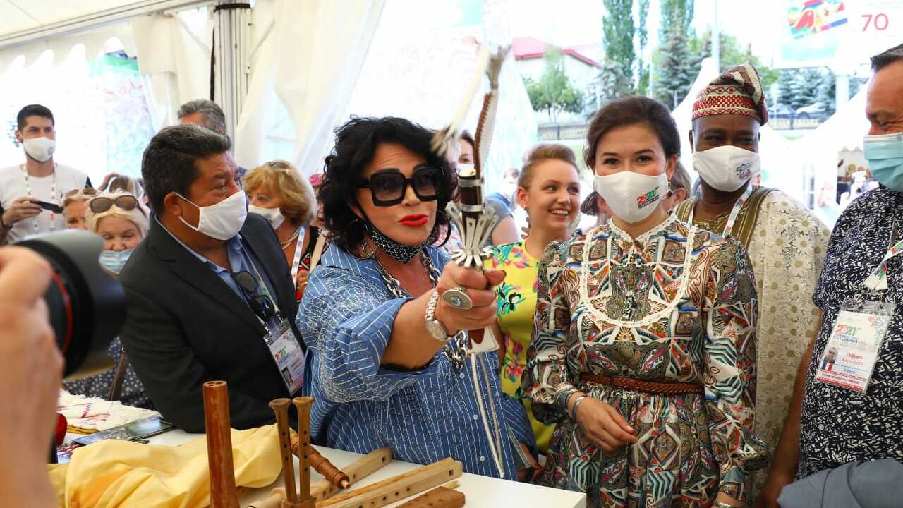 Посол Фольклориады, народная артистка России Надежда Бабкина на выставке ремесленников Фольклориады приобрела музыкальный инструмент для будущих выступлений. Также мастера ей преподнесли оригинальный кнут.