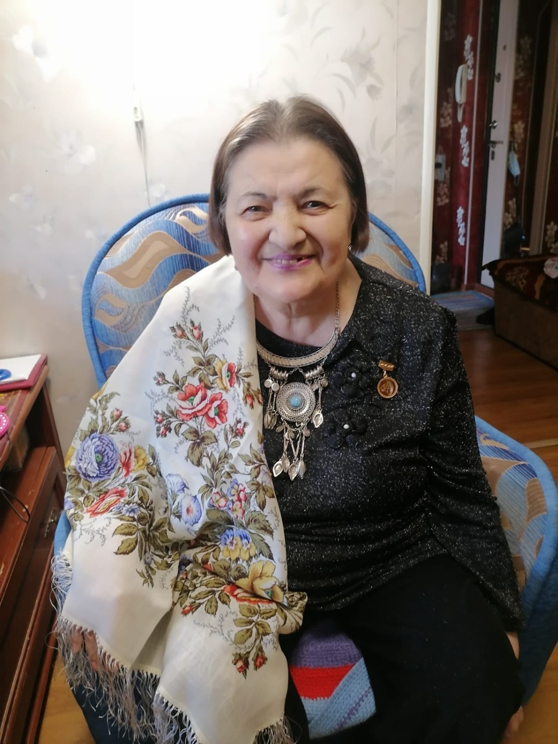 Также писательнице в подарок от Союза женщин России преподнесли павлопосадский платок.