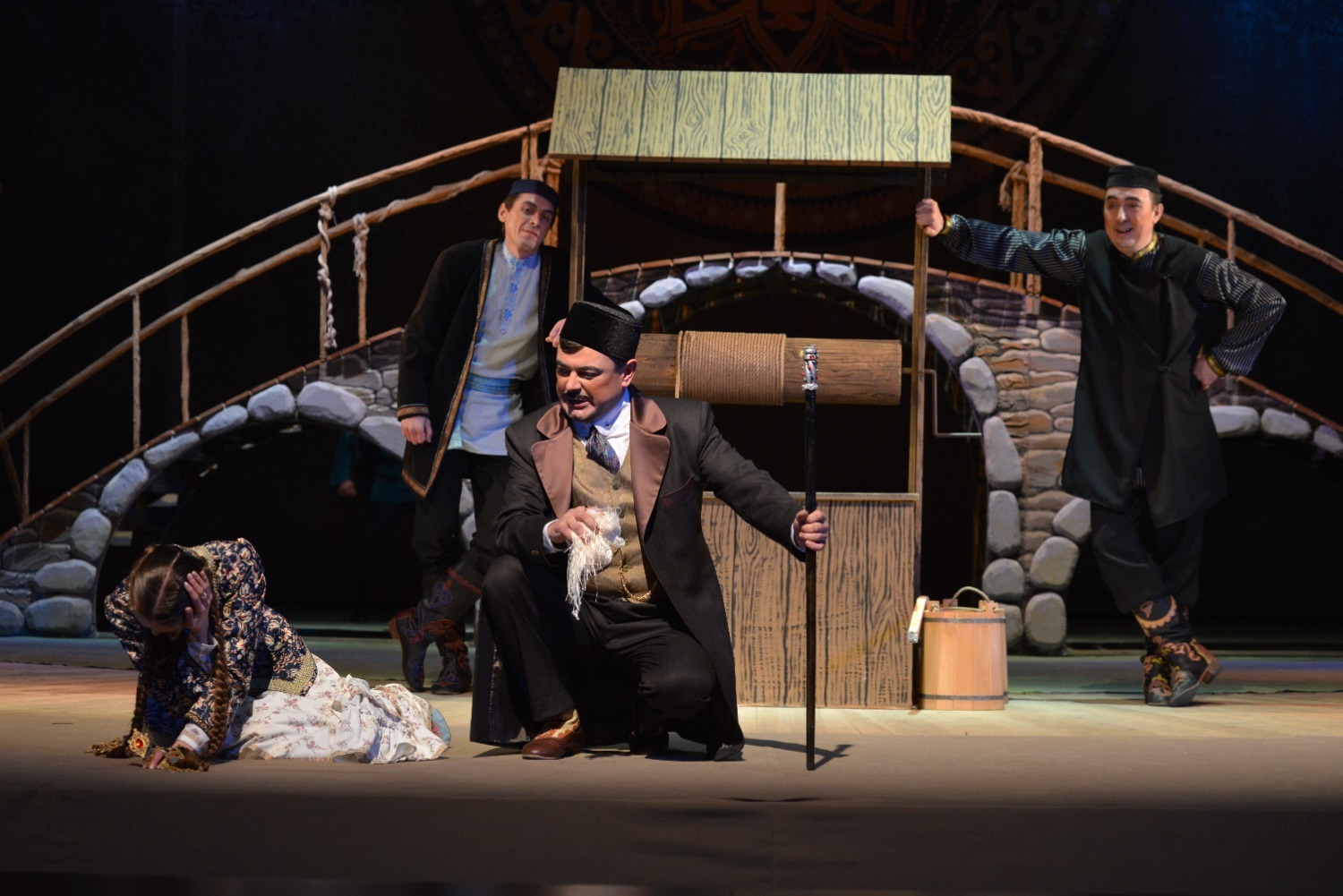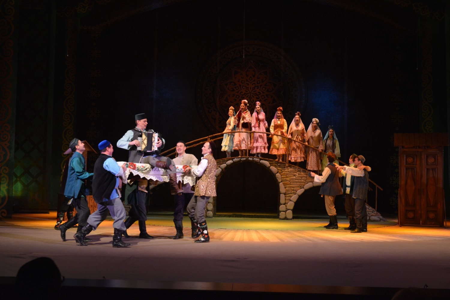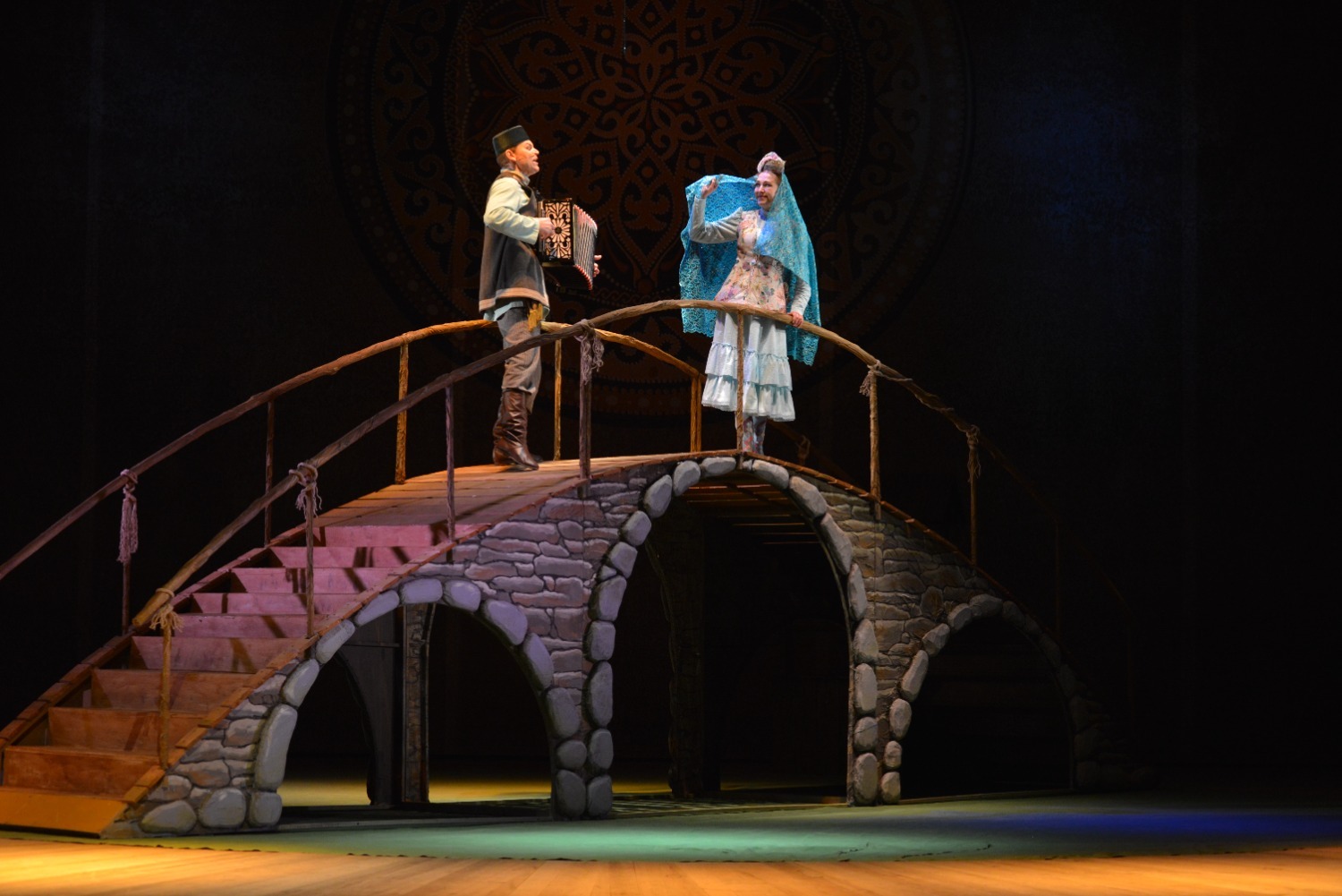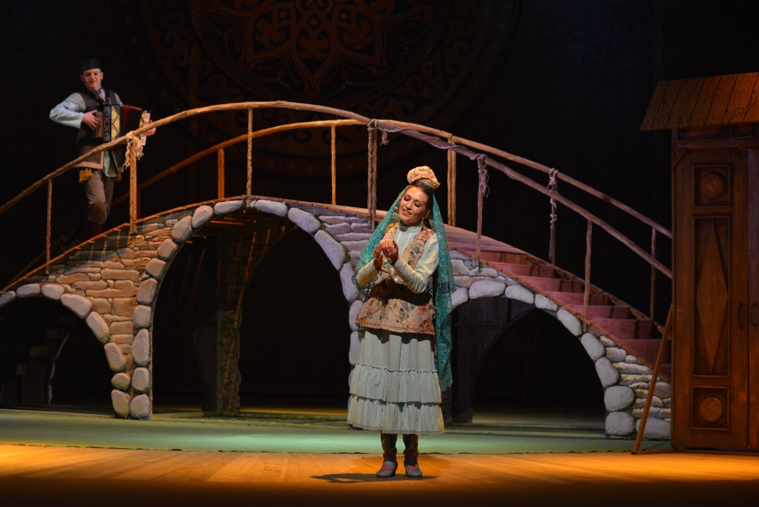Декорации на сцене хотя и выглядели достаточно скромными — полукруглый высокий мост, на котором происходило часть сцен, дверь, открывающаяся на улицу, топчан с подушками, качели, окно, колодец — но этого было вполне достаточно для общего восприятия спектакля.