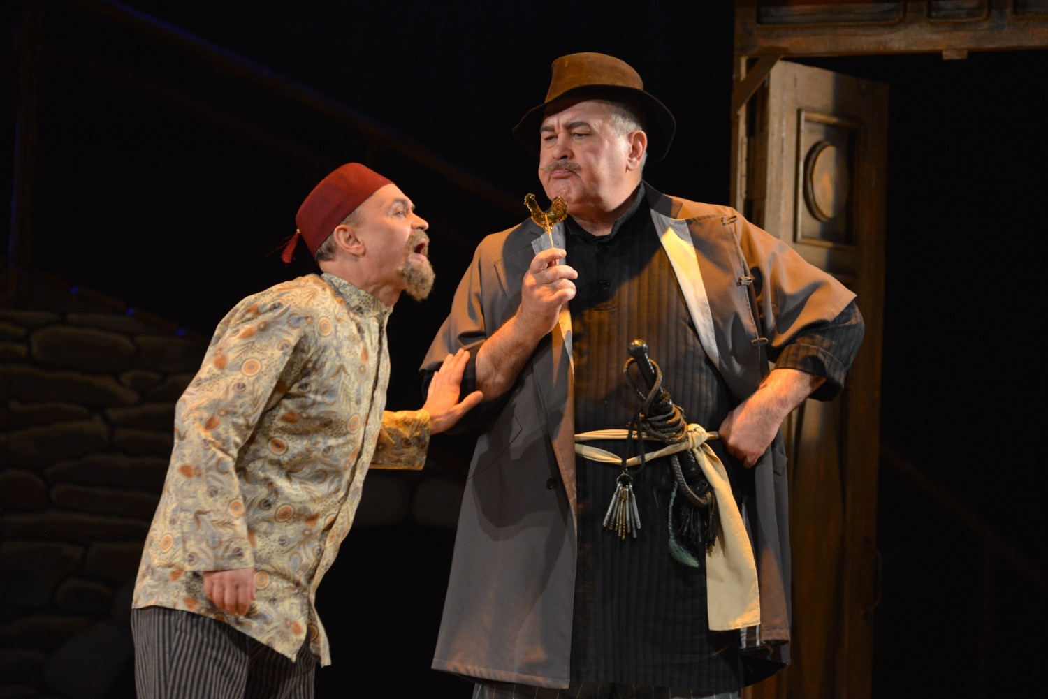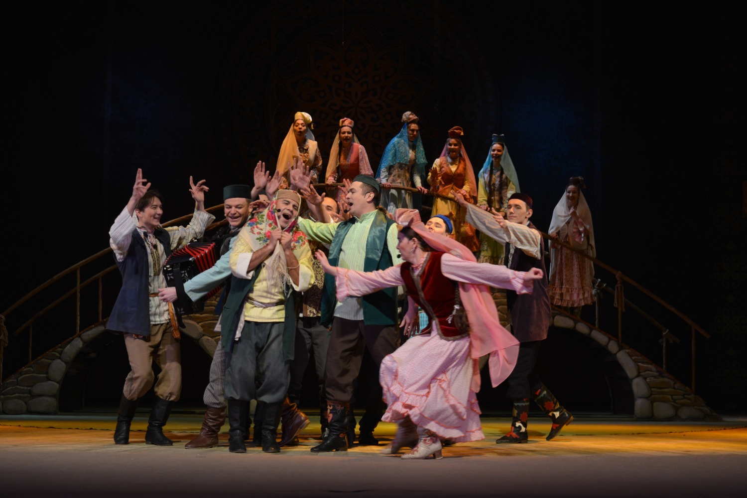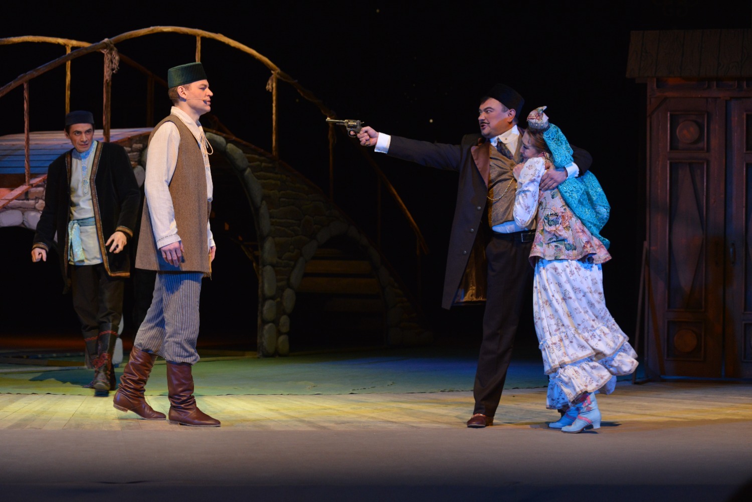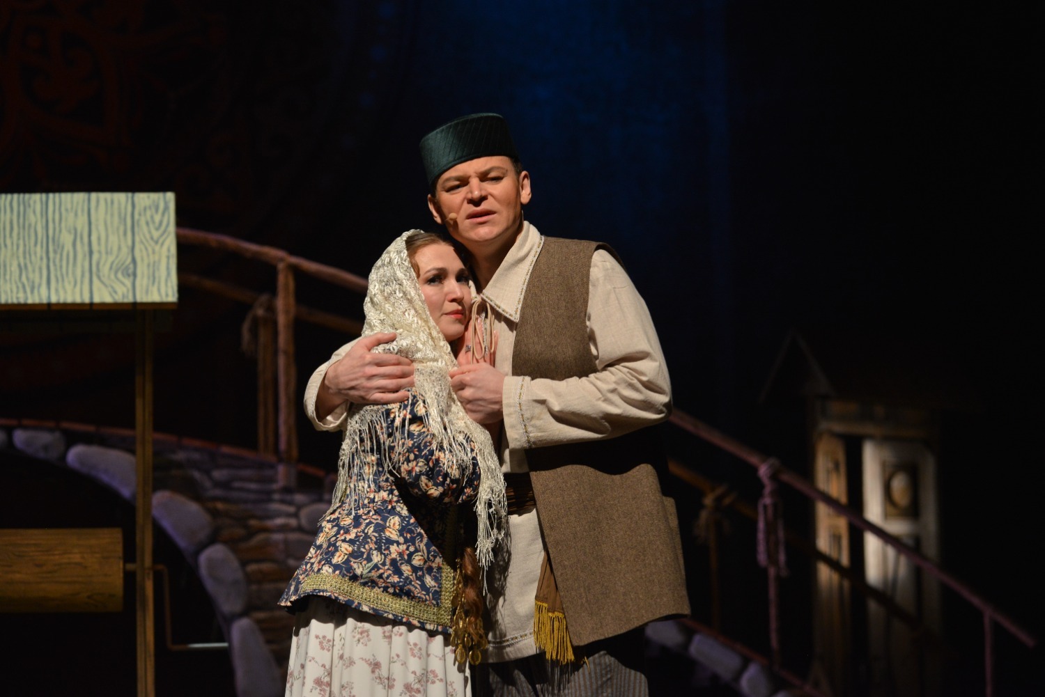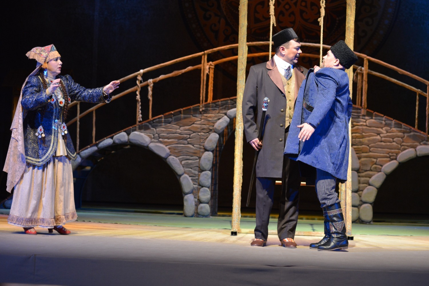 Декорации на сцене хотя и выглядели достаточно скромными — полукруглый высокий мост, на котором происходило часть сцен, дверь, открывающаяся на улицу, топчан с подушками, качели, окно, колодец — но этого было вполне достаточно для общего восприятия спектакля.