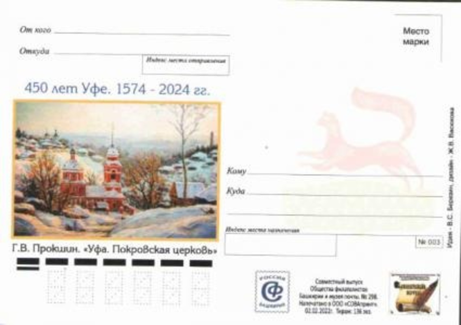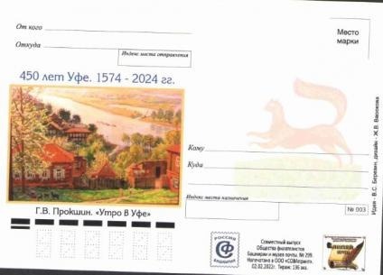 Две почтовые карточки начинают рассказ об Уфе на художественных полотнах наших художников. На них помещены картины уфимского художника Георгия Прокшина «Уфа. Покровская церковь» и «Утро в Уфе». Почтовые карточки посвящены предстоящему в 2024 году 450-летию города Уфы.