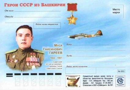 Еще одна почтовая карточка в серии «Герои СССР из Башкирии» выпущена к 100-летию со дня рождения дважды Героя Советского Союза лётчика Мусы Гареева.