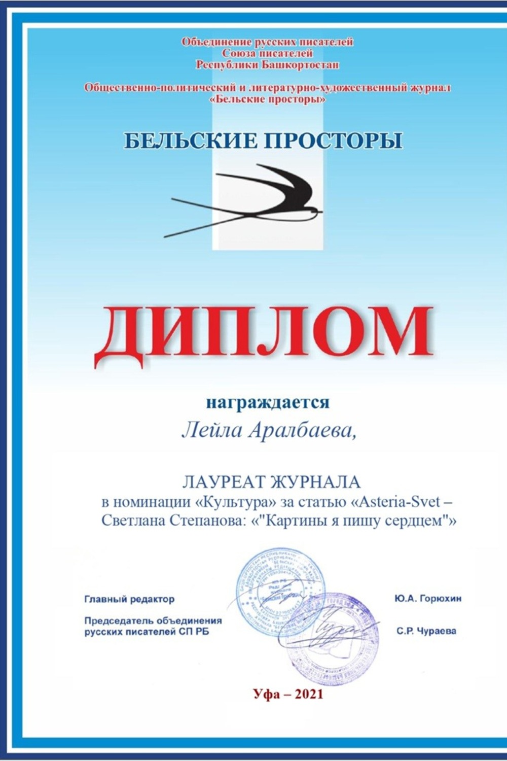 В номинации «Культура» лауреатом журнала признана обозреватель агентства «Башинформ» Лейла Аралбаева за статью «Asteria-Svet – Светлана Степанова: "Картины я пишу сердцем"». Комментируя свою победу в конкурсе литературного журнала, Лейла Аралбаева отметила, что ее статья посвящена талантливой башкирской художнице Светлане Степановой.