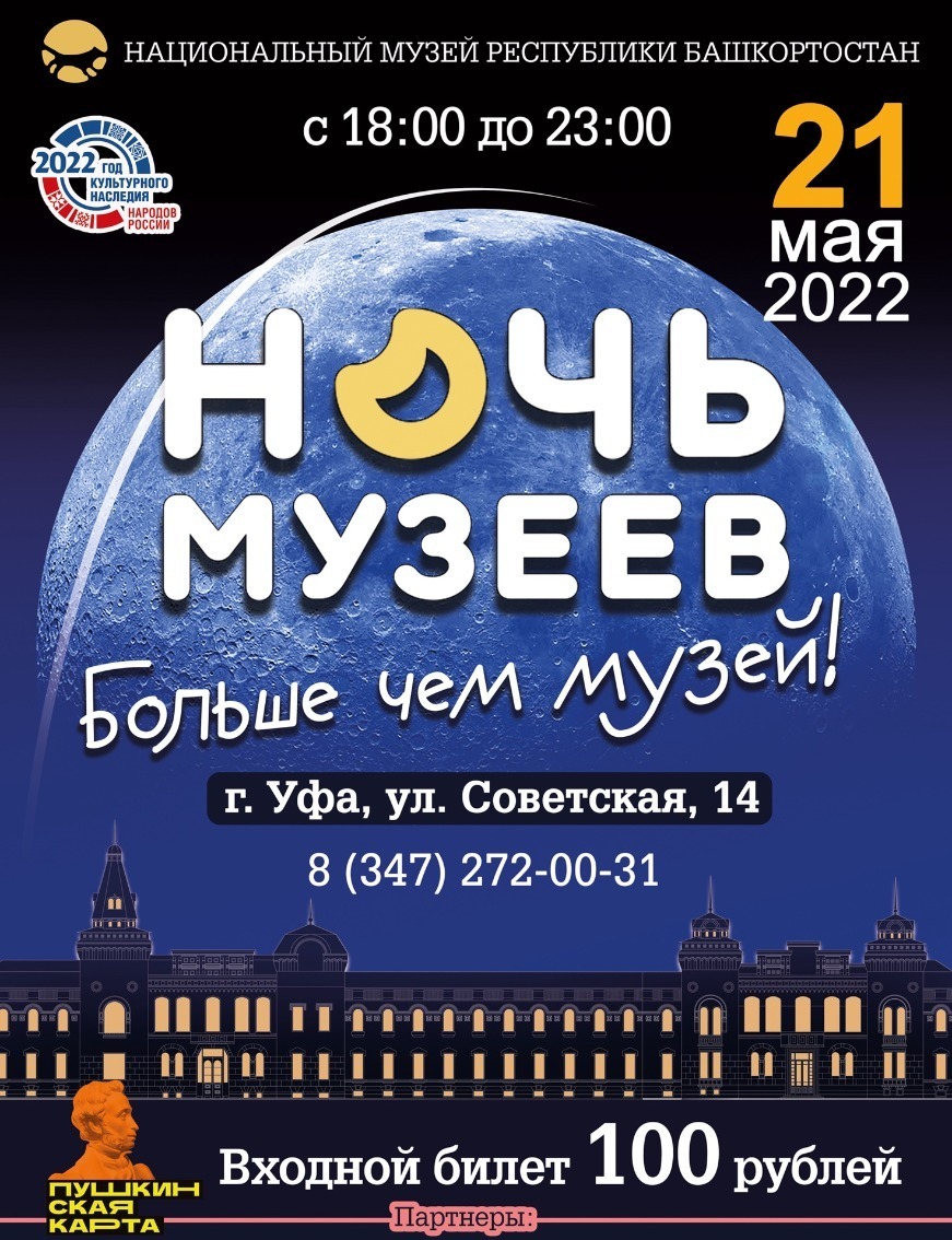 Вечером 21 мая, в 18.00 в Национальном музее Республики Башкортостан начнется самое масштабное, самое неординарное и долгожданное событие года — «Ночь музеев — 2022». Организаторы акции — Министерство культуры Российской Федерации и портал культурного наследия и традиций России «Культура.РФ».