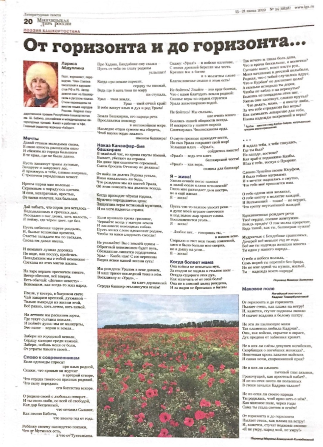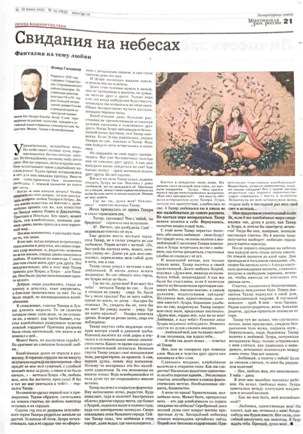 В «Литературной газете» увидели свет подборка стихов «От горизонта до горизонта» поэтессы Ларисы Абдуллиной и рассказ «Свидания на небесах» прозаика Флюра Галимова. Произведения башкирских писателей опубликованы в №24 от 15-21 июня 2022 года под рубрикой «Многоязыкая лира России».