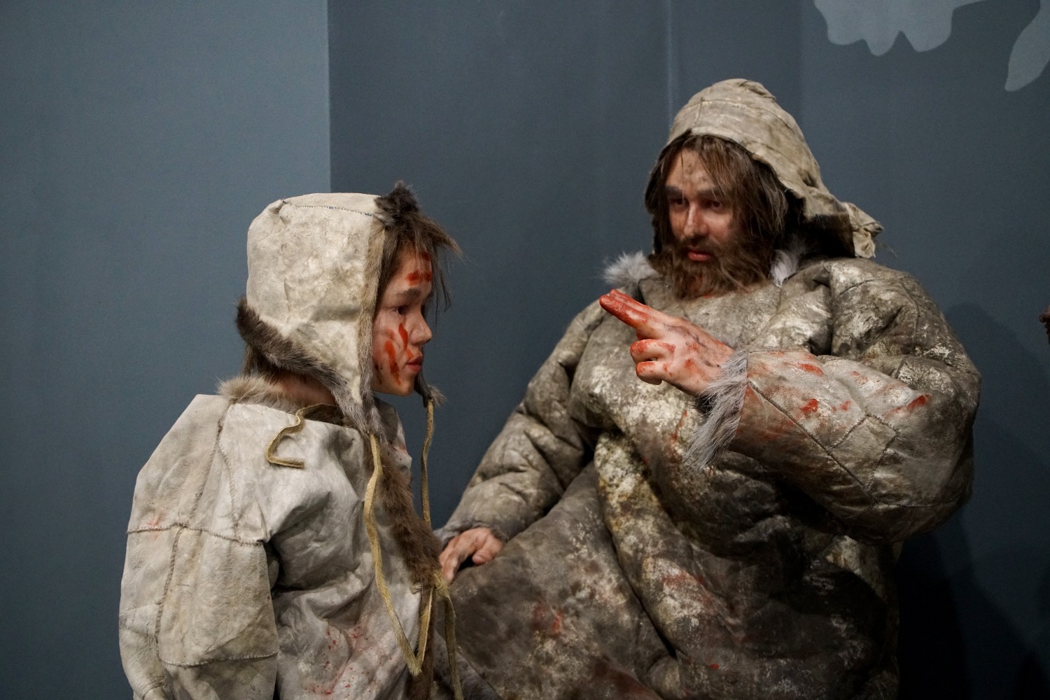 - В разделе экспозиции, посвященном археологии, мы очень точно реконструировали участок зала Знаков, где в 1980-е годы проводили раскопки ленинградские археологи под руководством Вячеслава Щелинского, - продолжает Николай Григорьев. - Сначала была воссоздана трехмерная модель раскопа по состоянию на 1984 год. В этой работе нам очень помогли сотрудники Центра палеоискусства Института археологии РАН, которые предоставили полевые чертежи и фотографии тех времен. Рядом с раскопом есть диорама с реалистичными манекенами древних людей, совершающих обряд инициации. Костюмы, одетые на манекены, сшиты жилами северного оленя из сыромятных шкур, закопчены в яранге в дыму карликовой березы, северной ивы и пропитаны жиром нерпы. Творческую реконструкцию костюмов выполнила жительница села Сёяха Ямало-Ненецкого автономного округа Нелля Мотышева. При реконструкции она использовала публикации о раскопках на археологической стоянке Сунгирь во Владимирской области. Нелля Нядмовна отмечала, что одежда древних людей была очень похожа на костюмы ее ненецких предков.
