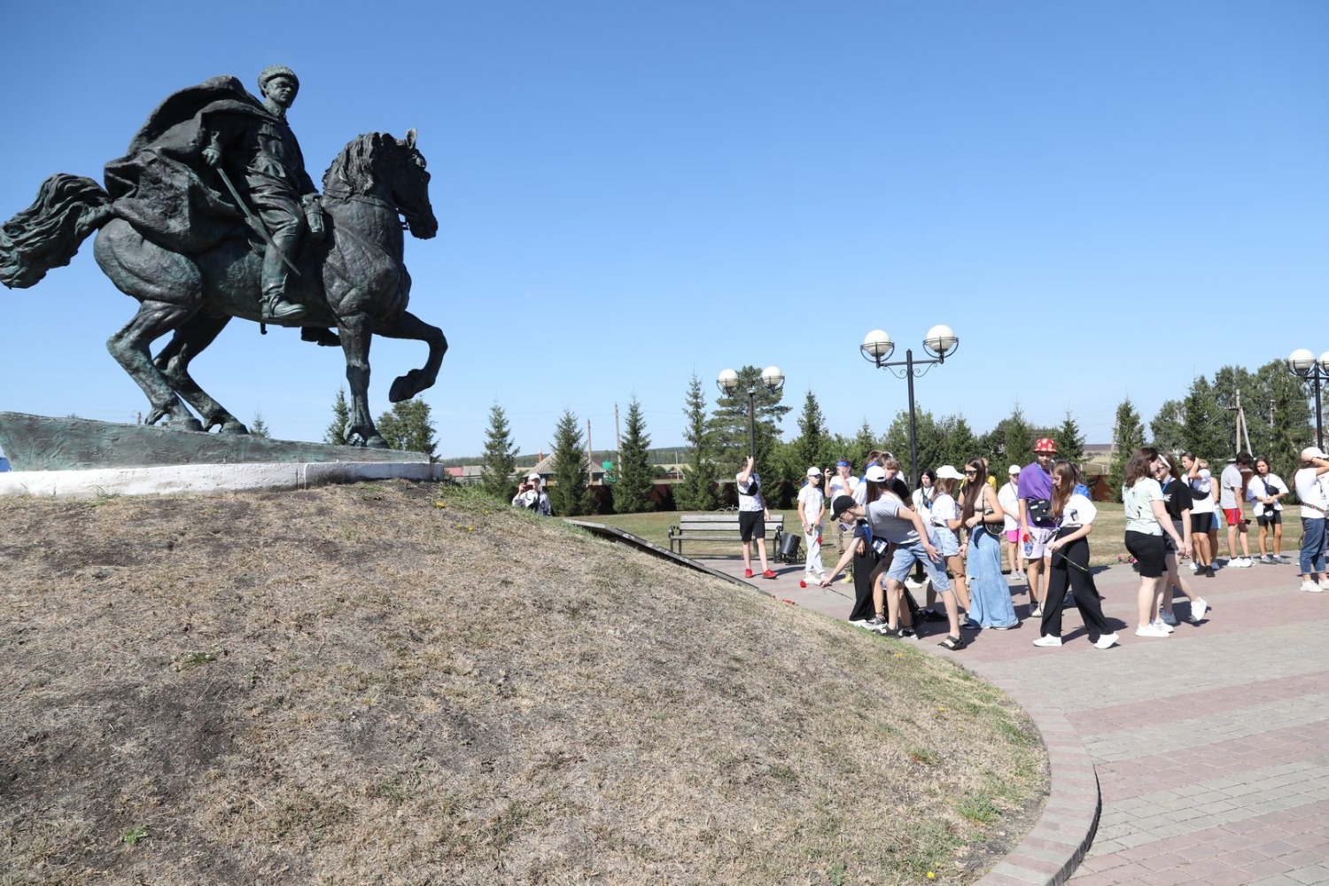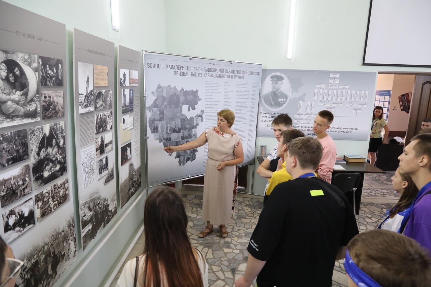 Школьники ознакомились с экспозицией выставочного зала им. Минигали Шаймуратова, послушали рассказ о боевом пути 112-й Башкирской кавалерийской дивизии и возложили цветы к памятнику и бюсту генерал-майора.