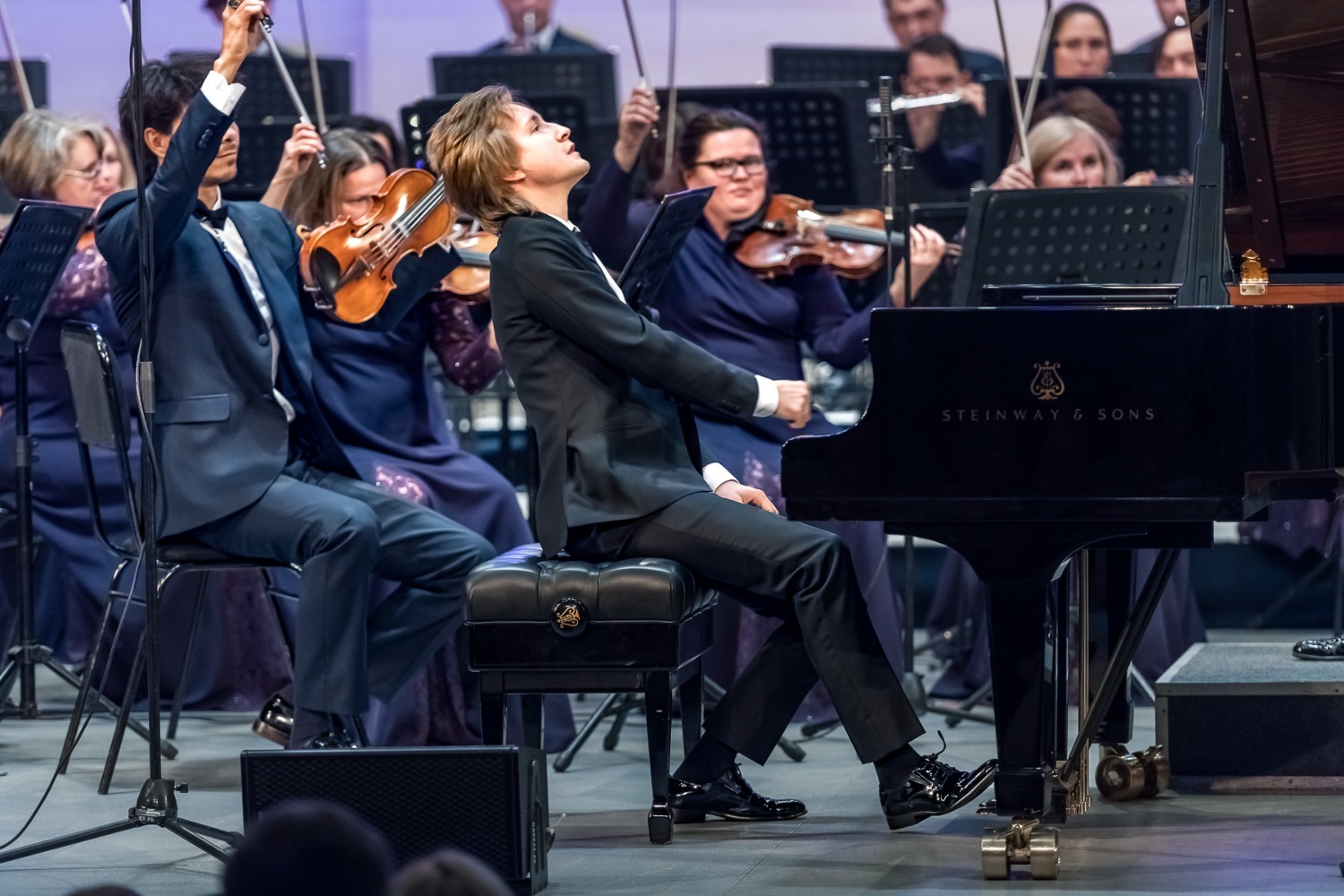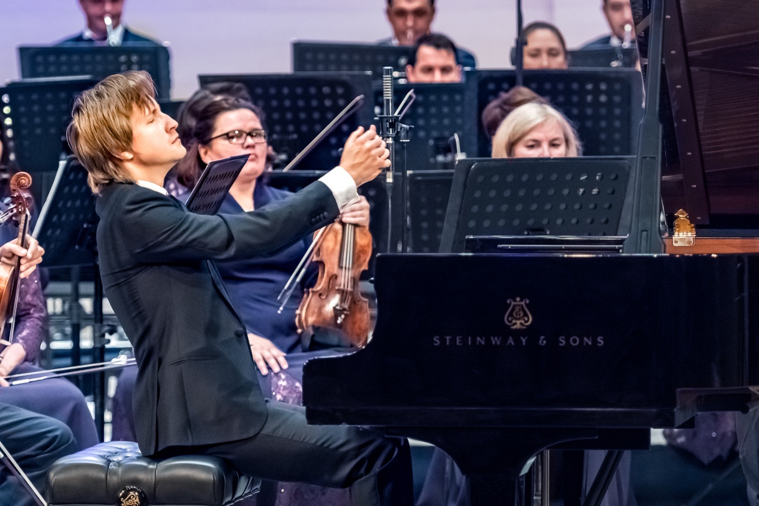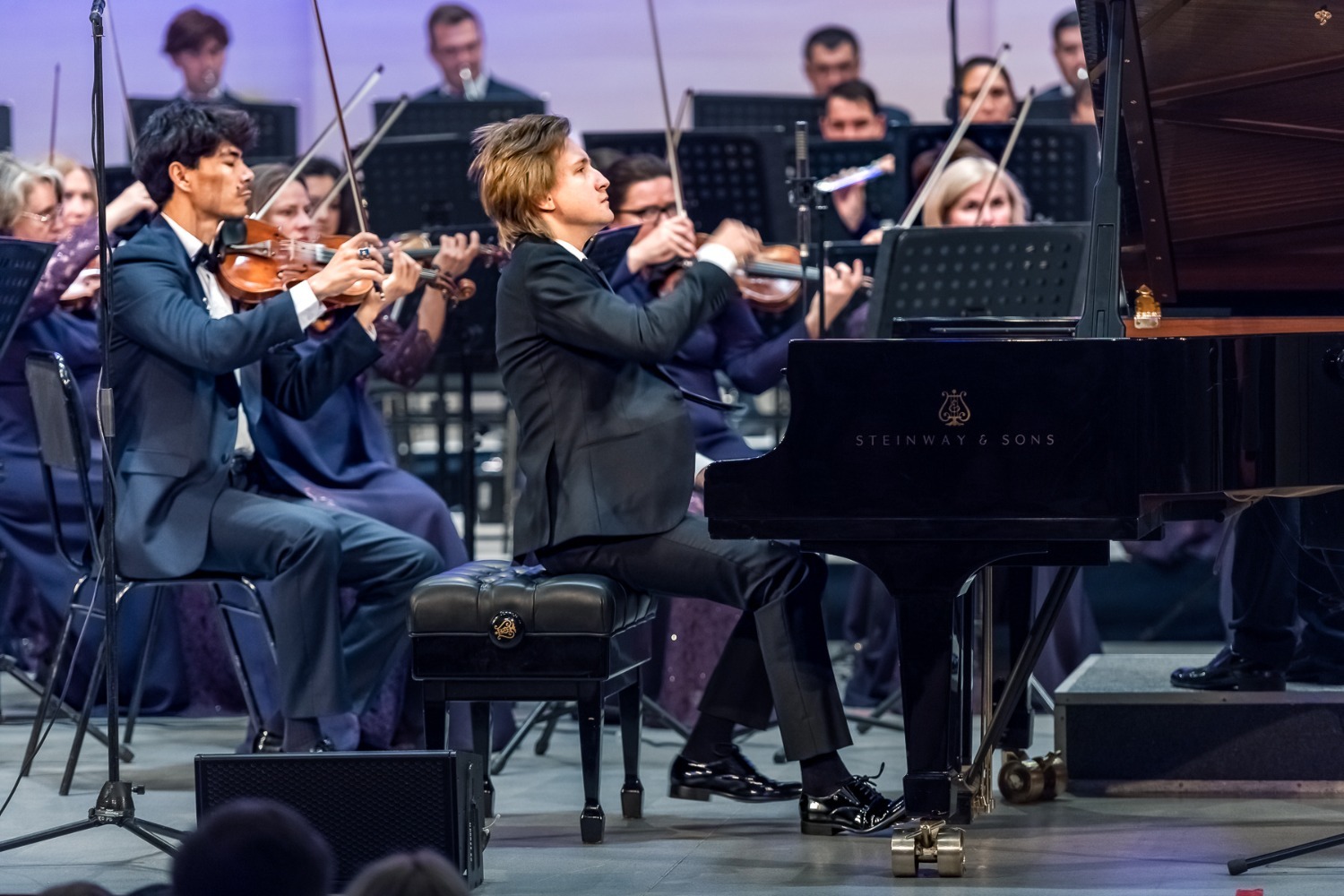 В первом отделении прозвучал знаменитый Второй до минорный концерт для фортепиано с оркестром Сергея Рахманинова. Солировал победитель XV Международного конкурса им. П. И. Чайковского, московский пианист Дмитрий Маслеев. Звучание шедевра русской классической музыки в прекрасном диалоге солиста и оркестра отличалось высоким качеством исполнения, эмоции концерта захватили всех слушателей. Как только отзвучал последний аккорд, зал взорвался аплодисментами. Долгая овация сподвигла пианиста сыграть на бис Элегию Рахманинова.