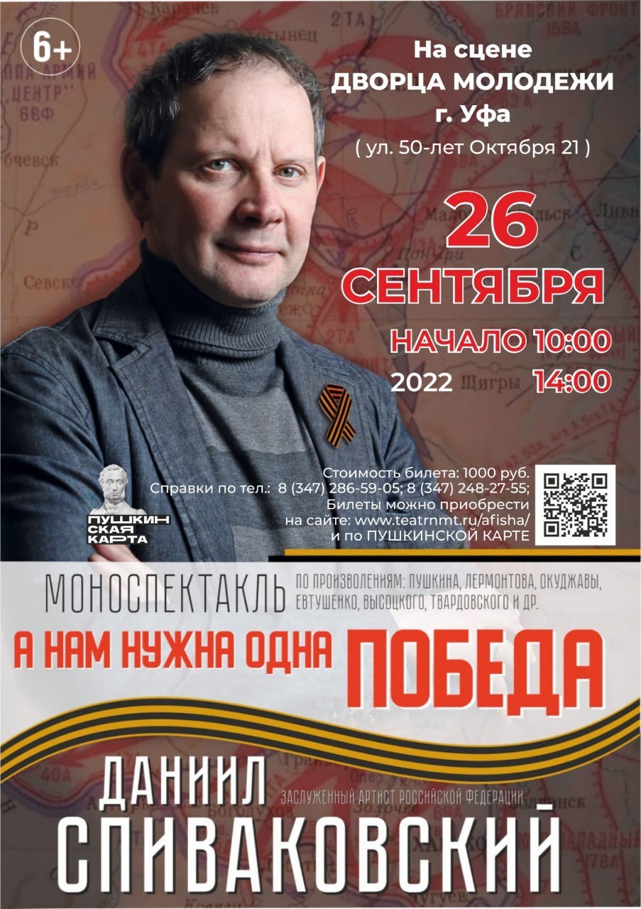 Второй моноспектакль — «А нам нужна одна Победа» словами великих писателей и поэтов расскажет о героизме русской армии, величии русского солдата и патриотизме народа во все времена — от Бородино до Берлина. Он впервые прозвучит в 10 и 14 часов на сцене ДК «Юбилейный».