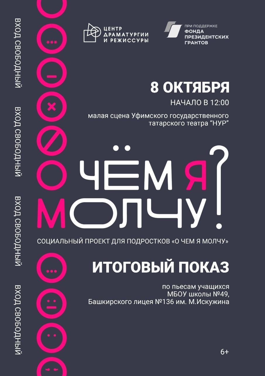 Пьесы были написаны учениками 7-9 классов в рамках I этапа, который прошел в апреле на базе четырех креативных школ Уфы и Уфимского района. Проект «О чем я молчу» – в составе победителей первого конкурса Фонда президентских грантов в 2022 году.