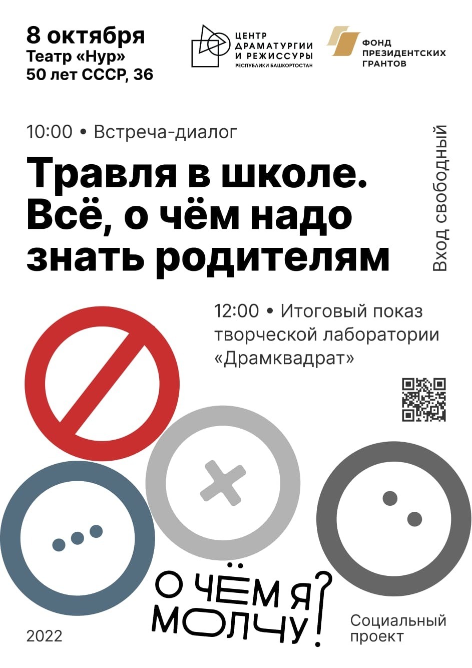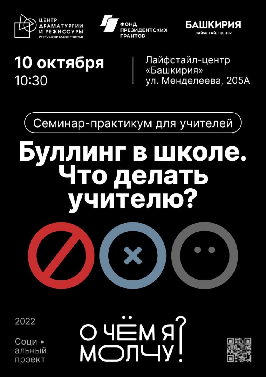 Социальный проект для подростков «О чем я молчу» основан на интеграции психологических и театральных технологий в образовательную творческую лабораторию «Драмквадрат» под руководством драматурга Ангизы Ишбулдиной. В 2022 году комплекс мероприятий направлен на создание пилотной практики по урегулированию и предотвращению школьной травли и кибербуллинга. Впервые в лабораторию «Драмквадрат», кроме основного интенсив-курса по драматургии и сценарного мастерства, были включены элементы психотерапии - с участниками проекта состоялись занятия на раскрытие коммуникативных навыков, командообразования, обучение методам психологической защиты, а также индивидуальная работа с профессиональными психологами в малых группах. На первом этапе участниками стали учащиеся пилотных школ проекта - башкирский лицей №136 им. М. Искужина, СОШ №49, Центр образования «Спутник» села Чесноковка и СОШ села Шамонино.