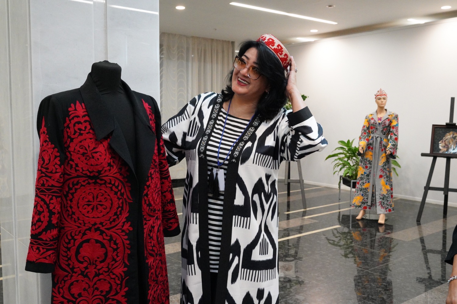 - Мы представляем кардиганы, чакан от модельера, художника, профессора Хуршеда Сатторова. Все кардиганы, халаты ручной работы. Они сшиты из натуральных материалов. Есть лёгкие накидки из шелка, хлопка, головные уборы - короны коштило, украшенные стразами Сваровски, тюбетейки. Надевают невесты, артисты, очень любят покупать иностранные туристы, - рассказала дизайнер Наргиз Мухаметжанова.