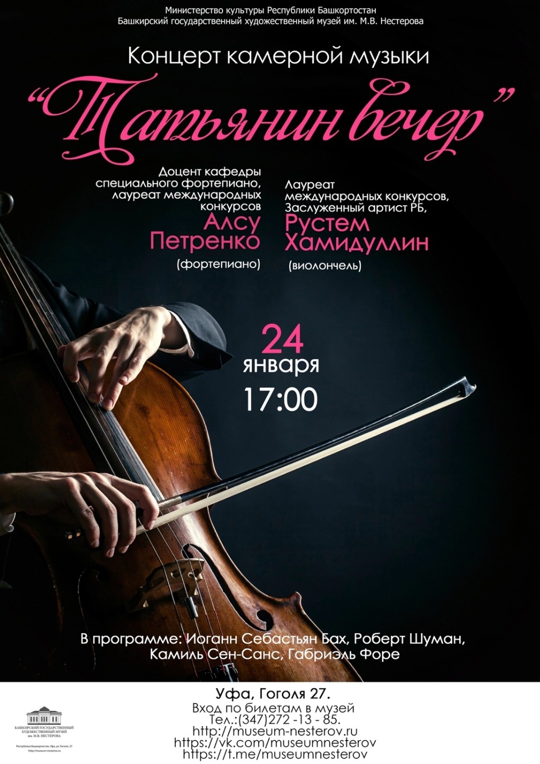 В музыкальной гостиной Башкирского художественного музея имени М. Нестерова в канун Дня российского студенчества и в рамках Года педагога и наставника пройдет традиционный камерный концерт «Татьянин вечер». Выступят известные молодые музыканты, лауреаты международных и всероссийских конкурсов: заслуженный артист Башкортостана Рустем Хамидуллин (виолончель) и Алсу Петренко (фортепиано).