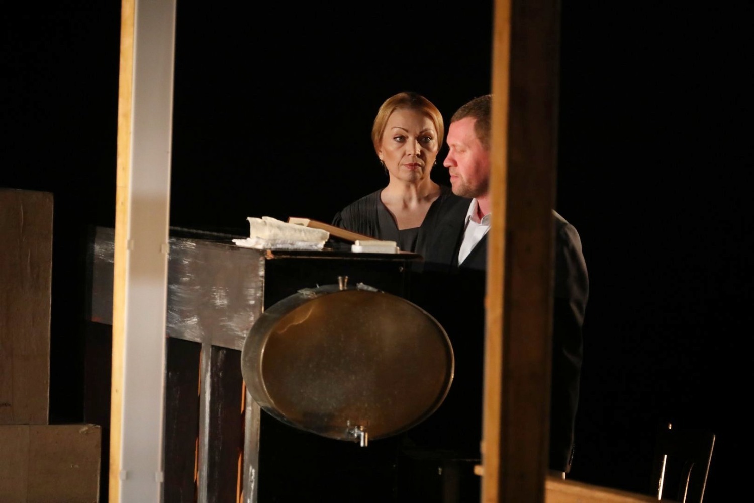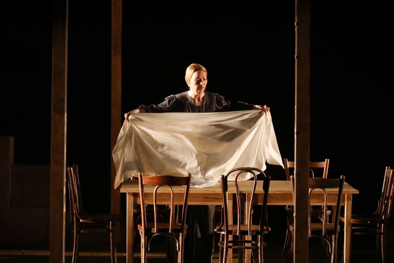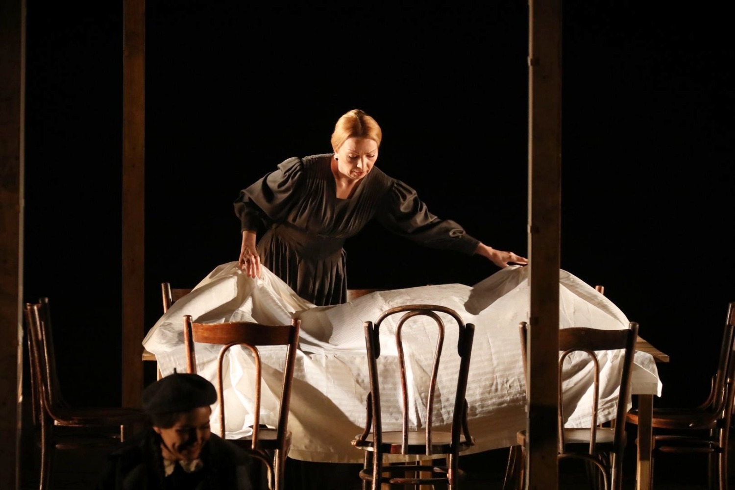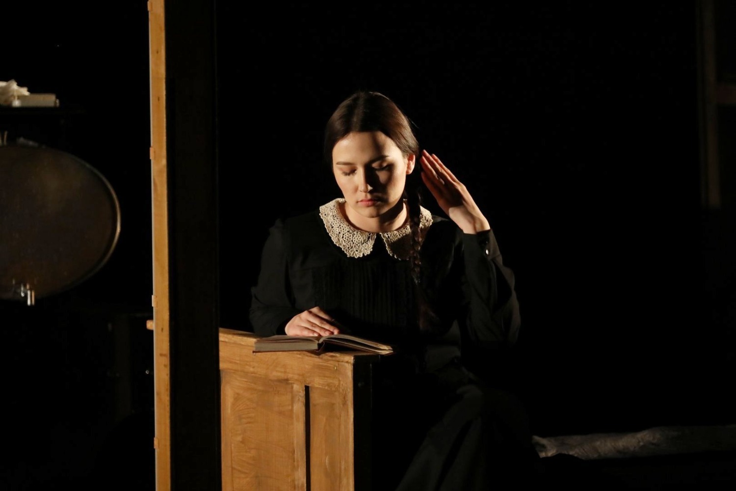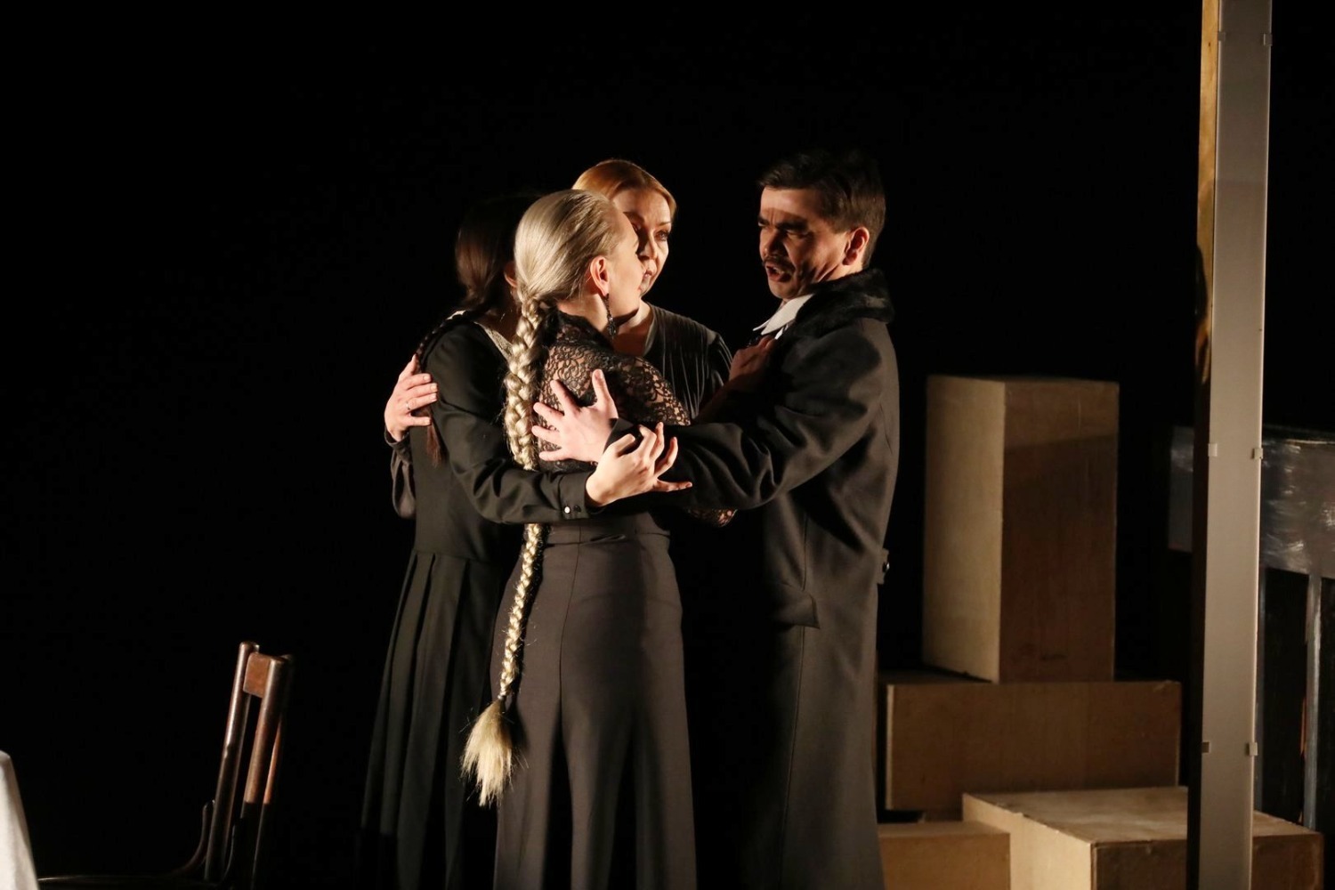 Для создания спектакля собралась команда единомышленников из Санкт-Петербурга — художник-постановщик Александр Мохов, художник по костюмам Мария Лукка, художник по свету Игорь Фомин. Действие захватывает пространство не только сцены, расширенной за счет первого ряда, но и зрительного зала. Сразу погружают в размышления декорации, где в основе пять прямоугольных арок — словно пять эшафотов пяти несчастных детей, когда у каждого свой крест, своя судьба, своя виселица. Если в первом акте еще сохраняется обманчивая целостность дома — с его традиционным убранством в виде стола, стульев, кровати, умывальника и даже пианино, — во втором иллюзия рушится, на сцене остаются только пять арок, пугающих и неотвратимых. Черно-белая графика декораций и костюмов позволяет сосредоточиться на главном — мысли.