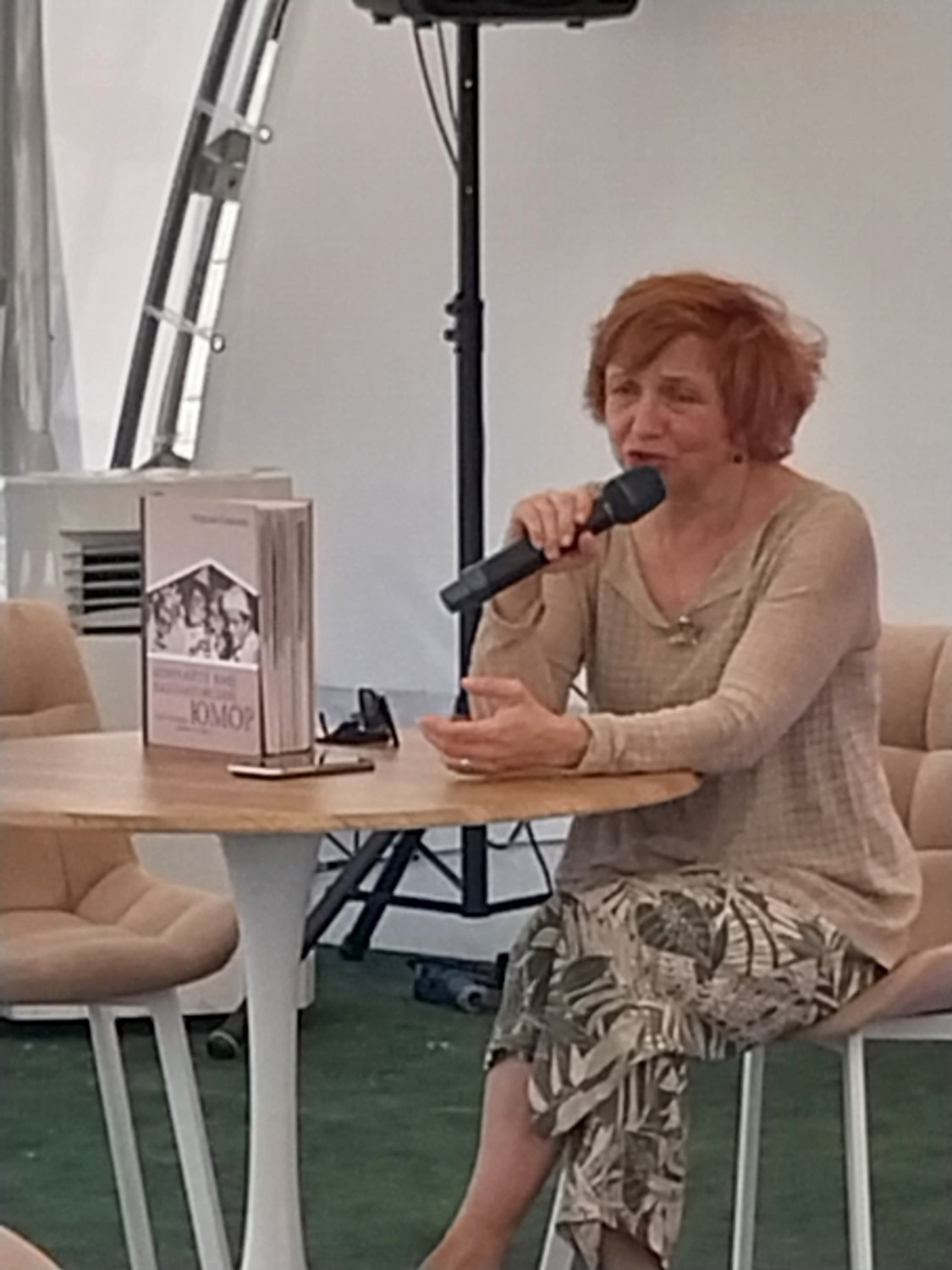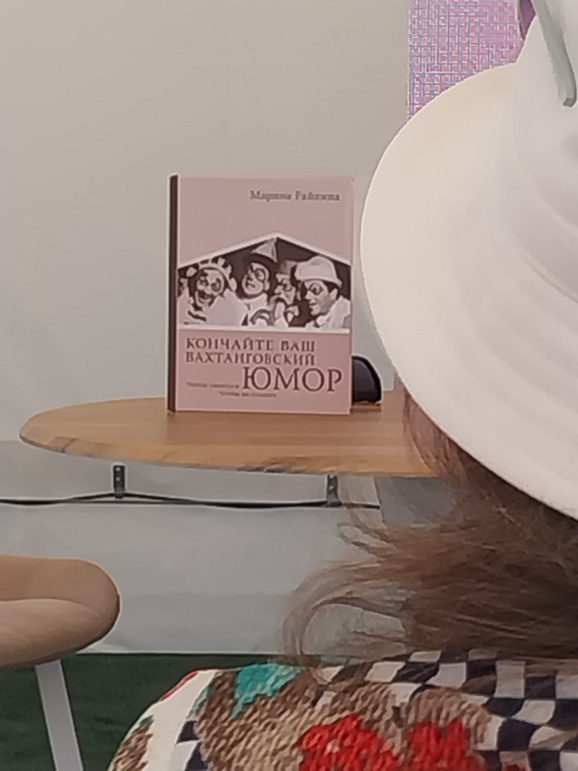 В заключительный день ярмарки Марина Райкина выступает на площадке лектория. Темой ее выступления стали книги о театре. Марина Александровна презентует свою книгу «Кончайте ваш вахтанговский юмор», которая была удостоена премии «Театральный роман».