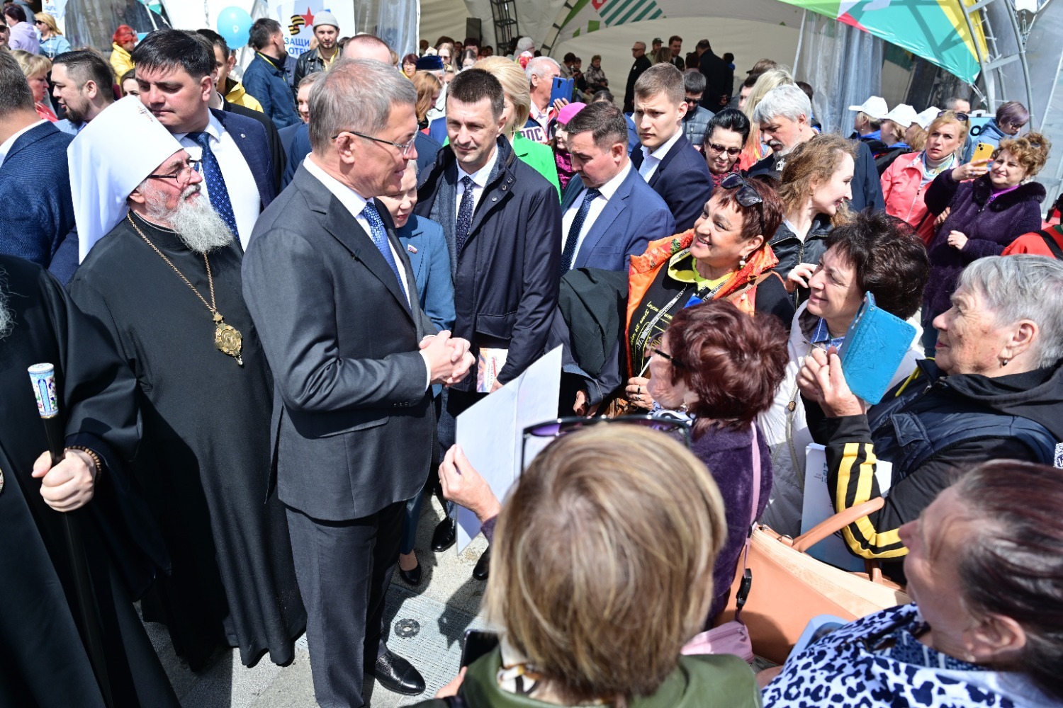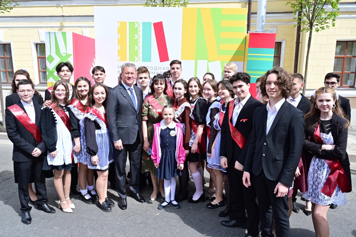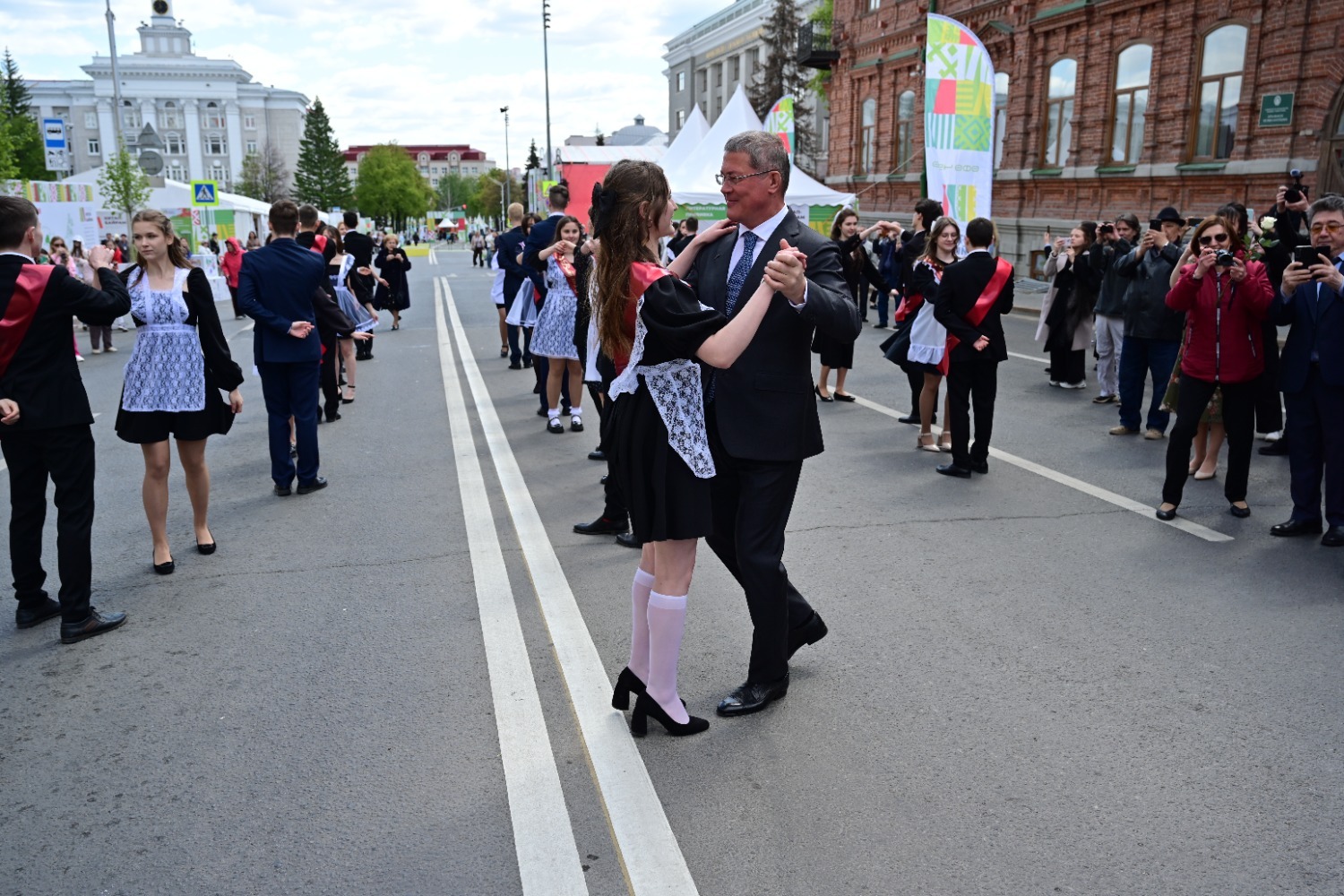 Главу Башкортостана на площадке первыми встретили выпускники уфимских школ, для которых сегодня прозвенел последний звонок. С одной из одиннадцатиклассниц Радий Хабиров станцевал школьный вальс.