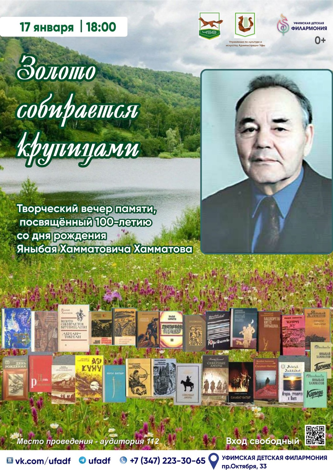 В Уфимской детской филармонии 17 января состоится вечер памяти, посвящённый 100-летию со дня рождения выдающегося башкирского писателя Яныбая Хамматова. По названию самого известного романа писателя вечер назвали «Золото собирается крупицами».