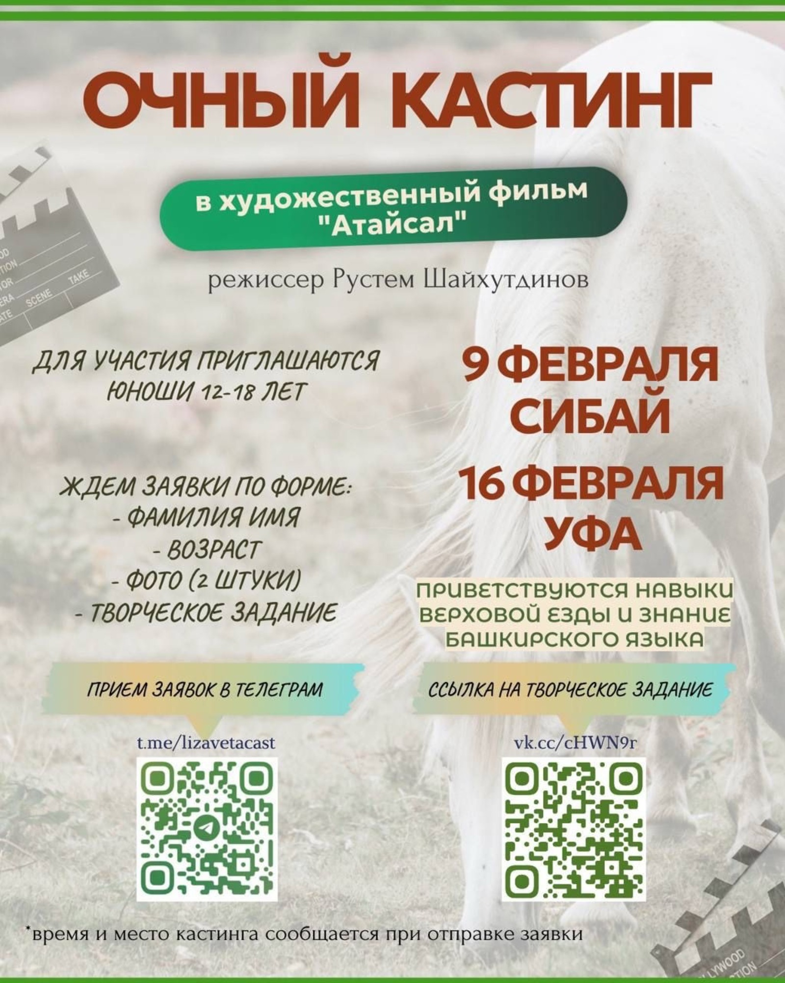 Жителей Башкирии приглашают на очный кастинг для художественного фильма «Атайсал». 9 февраля кастинг пройдет в Сибае, 16 февраля — в Уфе.