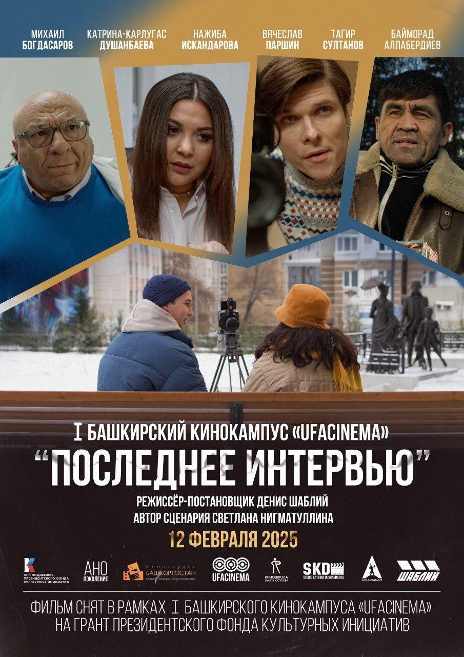 Участие в съемках приняли не только представители башкирской киноиндустрии, но и известные актеры. Так, в фильме «Последнее интервью» роли исполнили: Вячеслав Паршин, звезда нового сезона сериала «Молодежка», заслуженный артист РФ Михаил Богдасаров, Баймурат Аллабердиев — тот самый любимый всеми Юсуф из новогодних «Ёлок», Роман Попов, герой «Полицейского с Рублевки». Главные роли в фильме — и это принципиальная задумка команды — сыграли наши земляки, в том числе профессиональный актер Тагир Султанов («Саня, газуй!» «Универ») и Нажиба Искандарова («Сестренка», «Последний министр»).