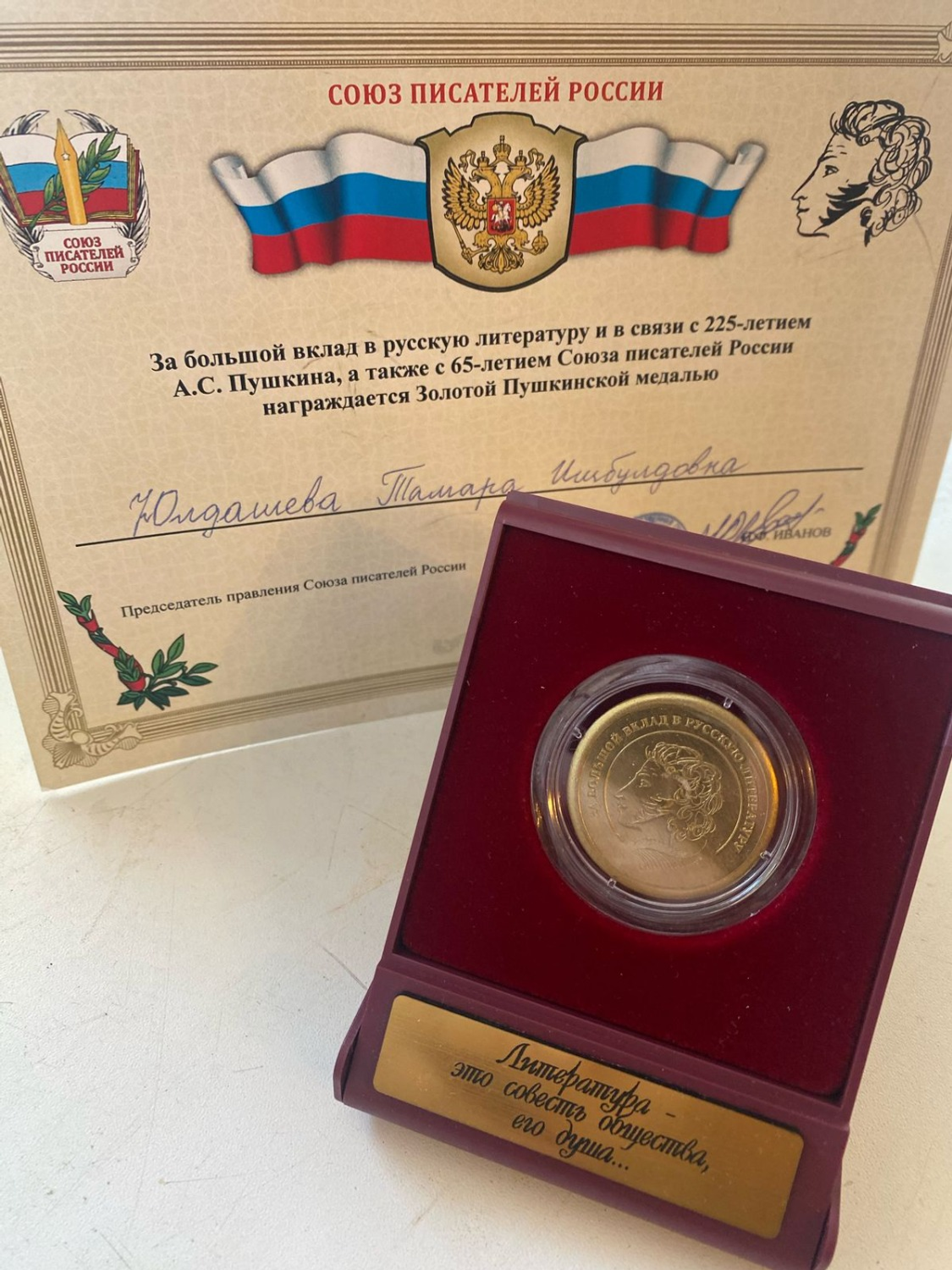 Золотой Пушкинской медалью от Союза писателей России награждена известная башкирская поэтесса Тамара Искандерия (Тамара Юлдашева). Мастер художественного слова удостоена этой престижной награды в связи с 225-летием со дня рождения великого русского классика и 65-летием со дня образования Союза писателей России.