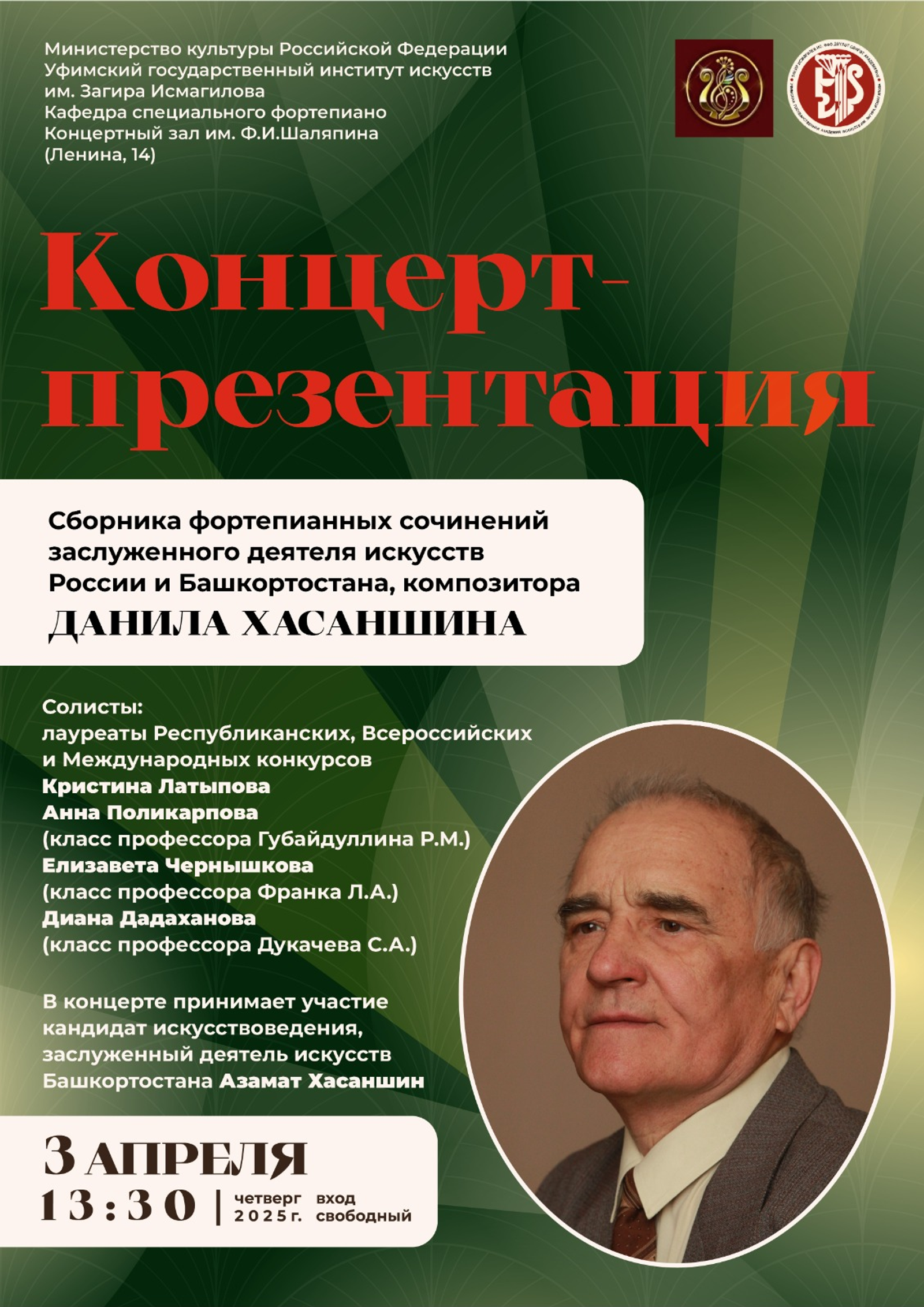 3 апреля в Концертном зале им. Ф. Шаляпина Уфимского государственного института искусств им. З. Исмагилова пройдёт концерт-презентация сборника фортепианных сочинений старейшего композитора республики, заслуженного деятеля искусств России и Башкортостана Данила Хасаншина.