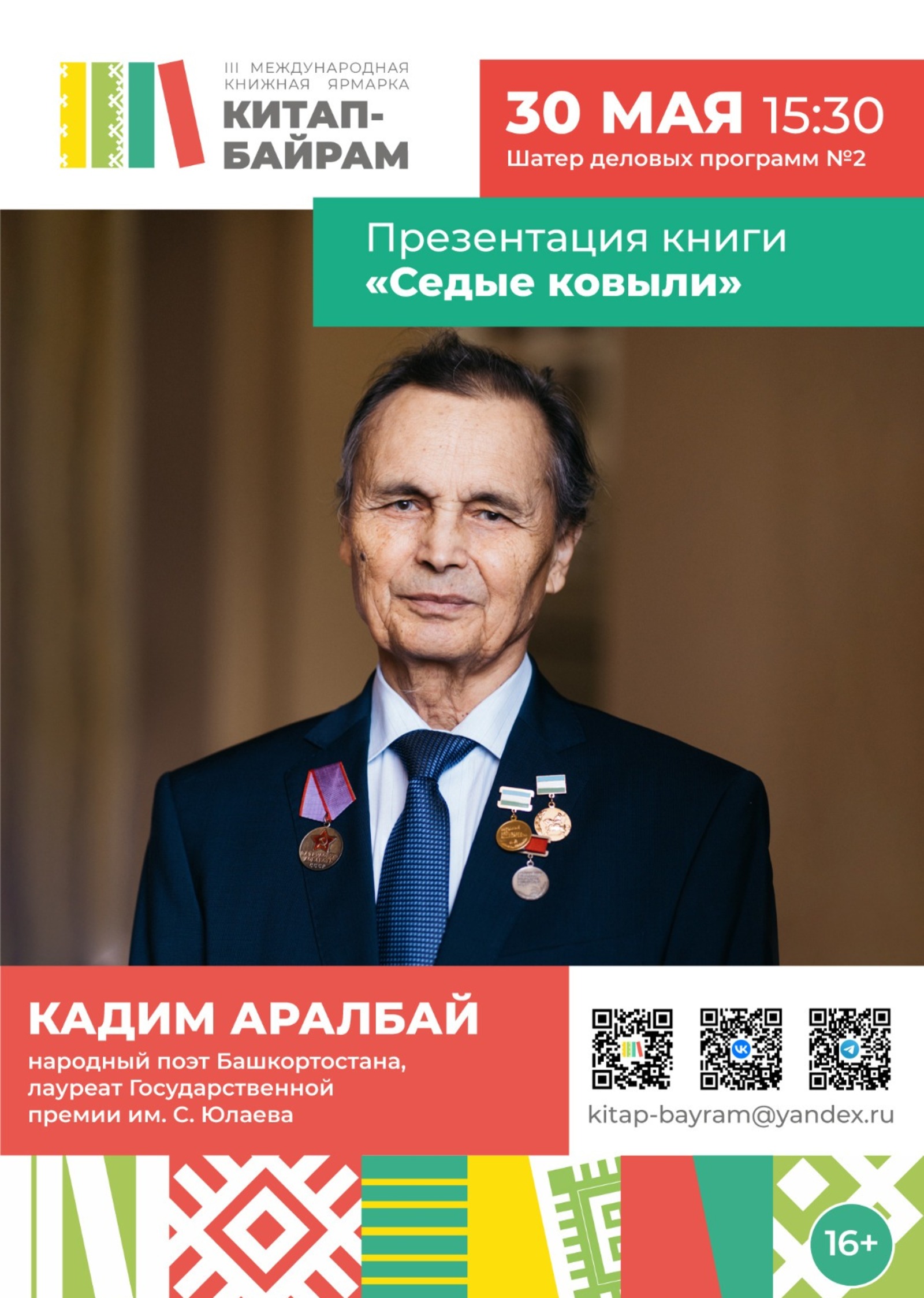 В рамках III Международной книжной ярмарки «Китап-Байрам» состоится презентация новой книги народного поэта Башкортостана Кадима Аралбая «Седые ковыли». Мероприятие запланировано 30 мая в 15.30 во втором шатре. На презентации прозвучат стихи, можно будет пообщаться с автором, задать вопросы, взять автограф.