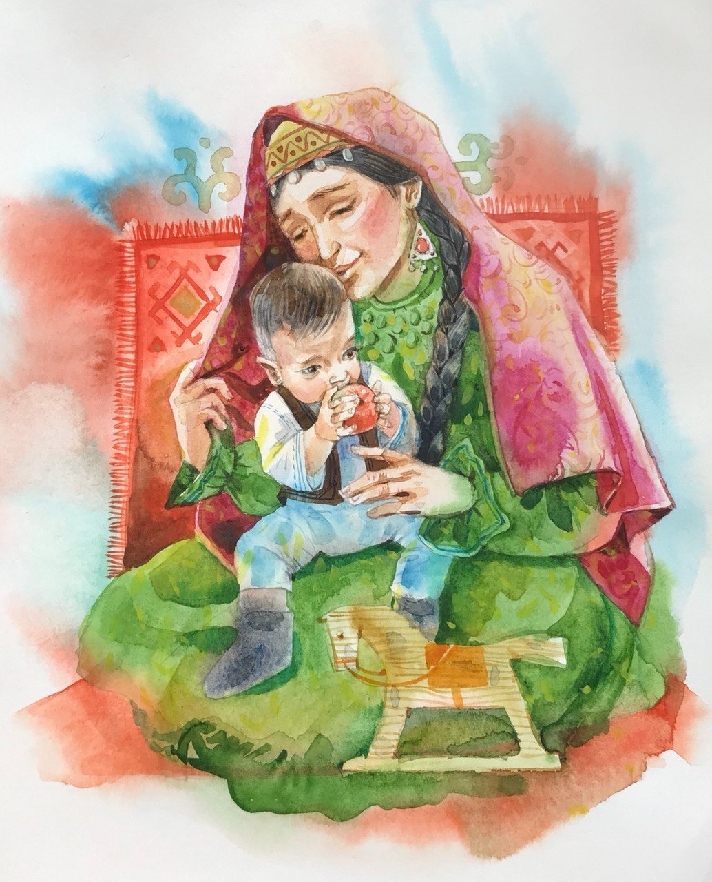 Хочу отметить, что сам процесс иллюстрирования очень увлекателен. Начиная даже с того момента, когда ко мне обращаются с такой просьбой. Я погружаюсь в волнительное предвкушение, потому что конечный результат непременно принесет мне удовольствие и ощущение счастья. Скорее хочется взять в руки текст и погрузиться в чтение. Если я читаю на башкирском, то и думать начинаю на этом языке. И как будто «вижу» фильм со стоп-кадрами, которые впоследствии будут эскизами. Затем уже эти наброски я дорабатываю, усложняю, обогащаю, привожу к общей концепции книги. После этого начинается чистовая работа — перевожу черновики на акварельную бумагу и принимаюсь писать в цвете. На каждую полосную иллюстрацию у меня уходит примерно по времени одна неделя. Не люблю, когда меня отвлекают во время этого процесса и не люблю, когда заказчик считает, что нарисовать иллюстрацию — это пустяковая легкая работа для художника и целую книгу можно легко проиллюстрировать за несколько дней. Иногда даже отмечаю для себя, что писать станковую живопись маслом или акрилом мне легче чем, казалось бы, меньшую по размерам иллюстрацию. Важно, чтобы акварель выглядела «легко написанной». Иногда для достижения такого результата приходится переделывать иллюстрацию на новом листе. Акварельная бумага очень капризна, не терпит повторных поправок.