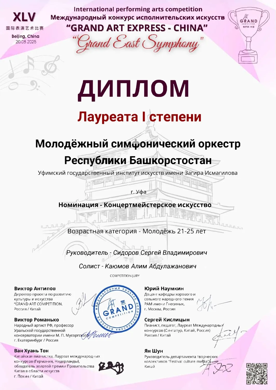 Оркестр под управлением художественного руководителя и главного дирижёра, доцента Сергея Сидорова завоевал диплом в номинации концертмейстерское искусство.