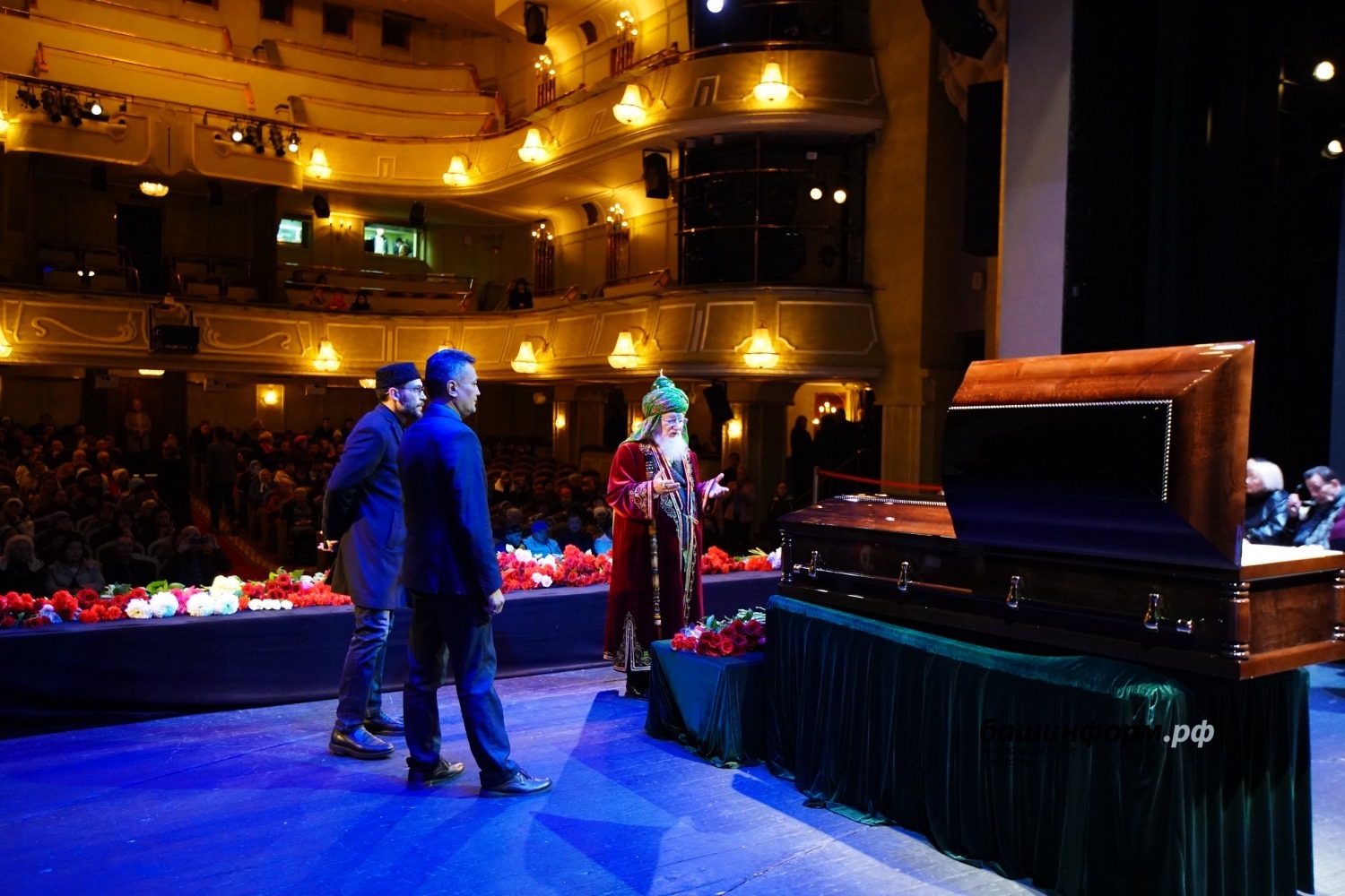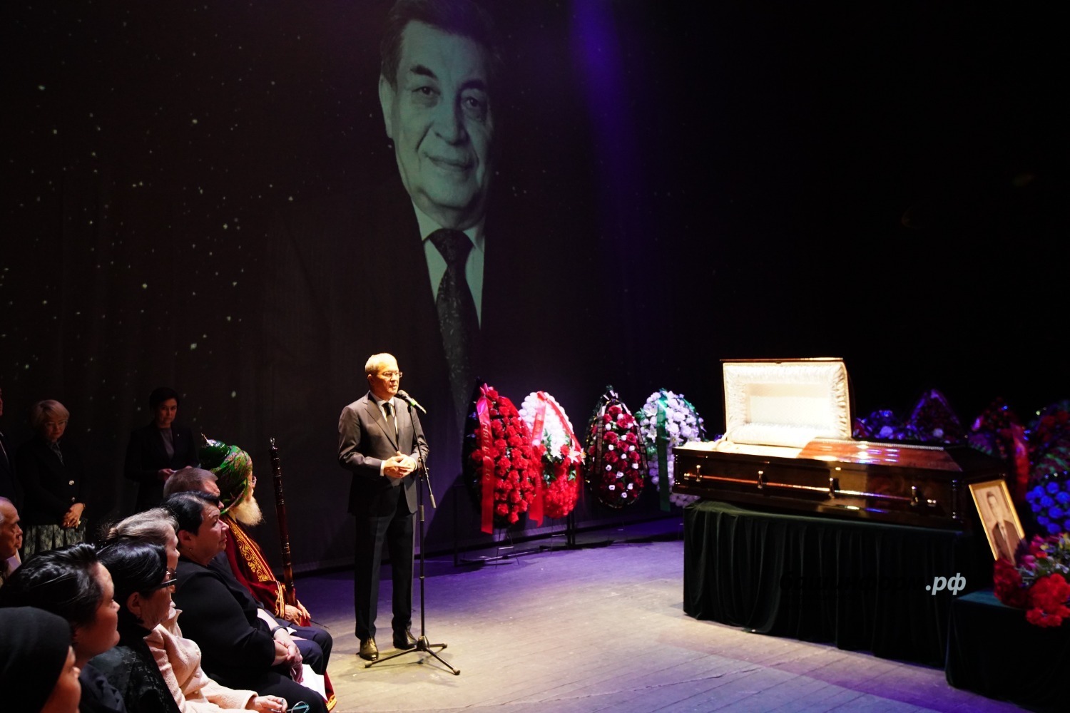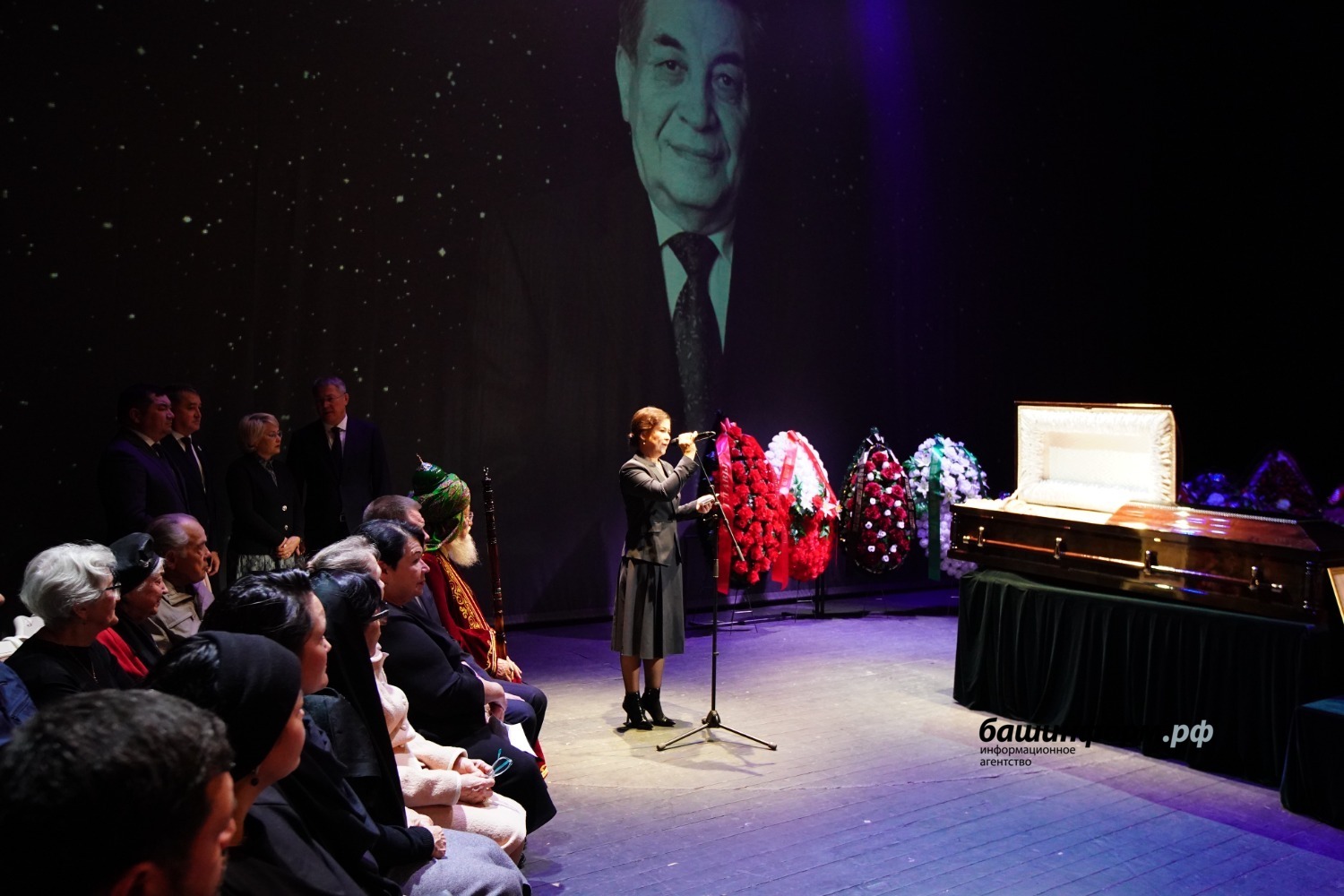 «Хөрмәтле Анфиса Муллаяновна! Хөрмәтле Владислав Олегович! Хөрмәтле Олег Закировичтың туғандары! Хөрмәтле иптәштәр, дуҫтар! Мы все здесь с очень тяжёлым сердцем собрались в нашем любимом театре. Буквально полгода назад на этой сцене мы провожали в последний путь Фидана Сафича Гафарова. И с именами Фидана Сафича, Олега Закировича, такое ощущение, что уходит золотой век башкирского театра. Это очень горькая для нас и преждевременная потеря.
