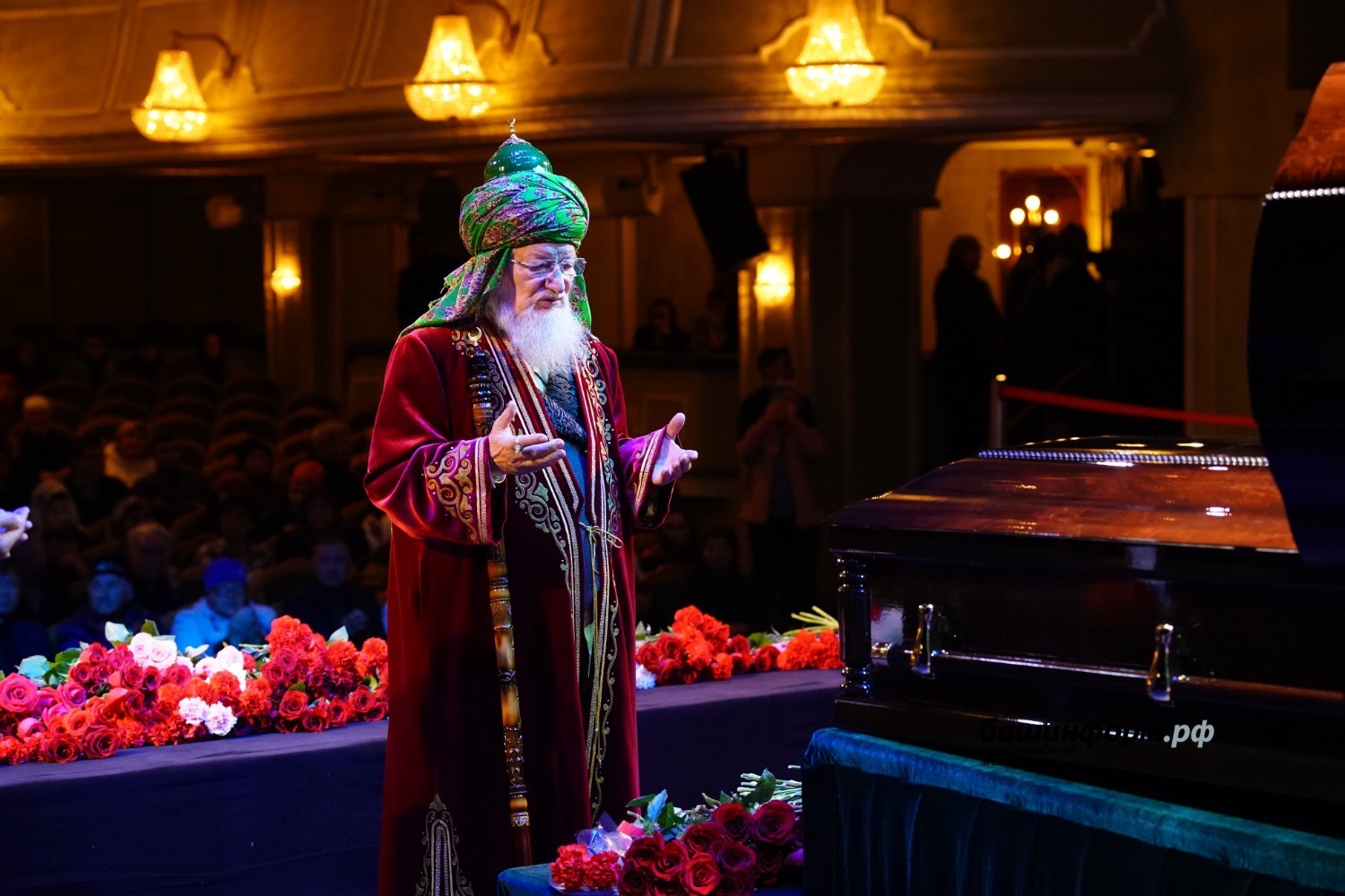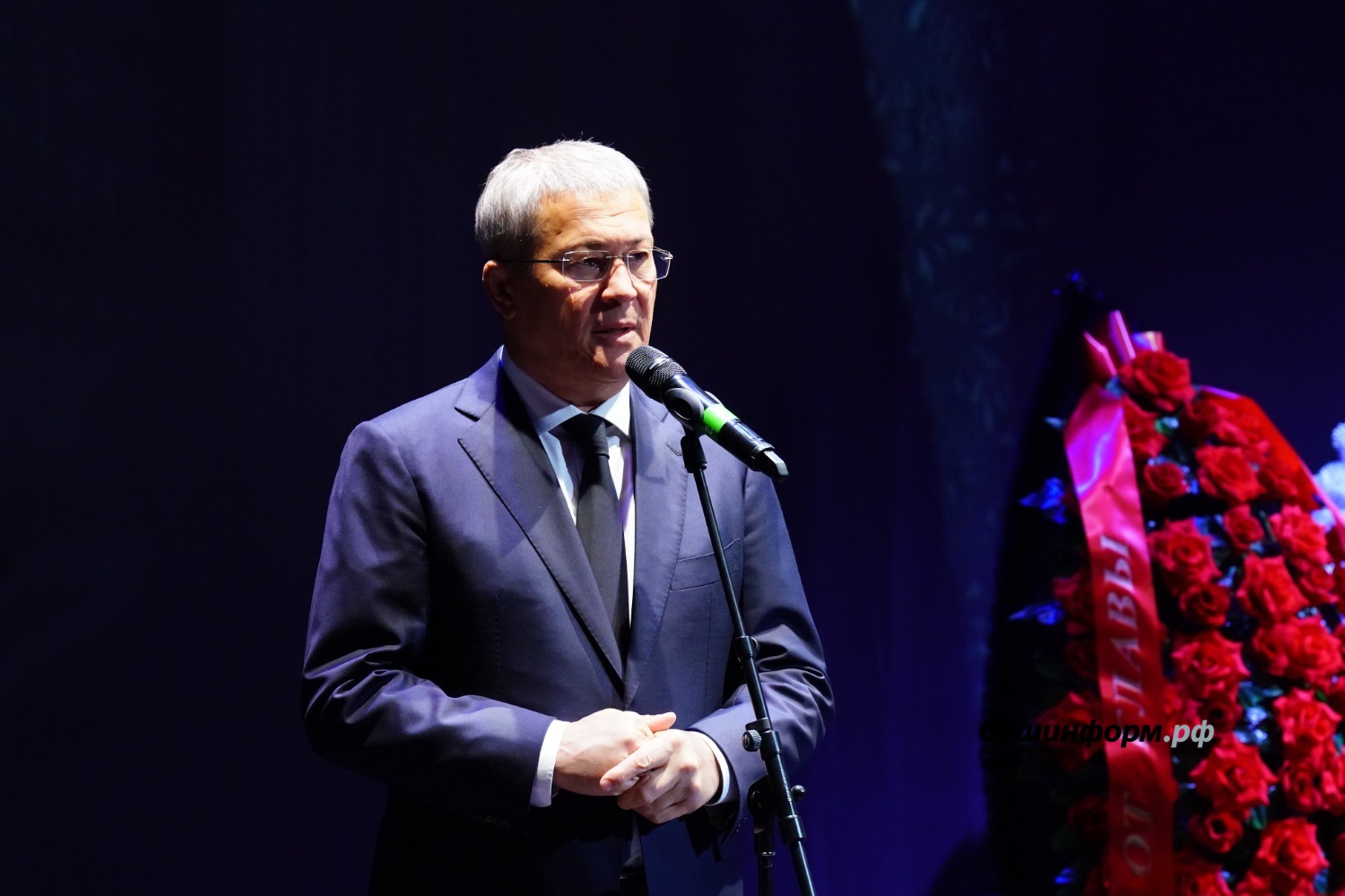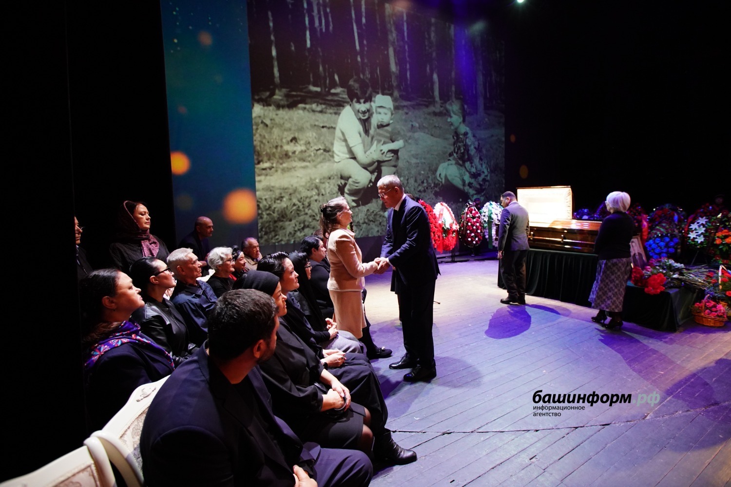 «Хөрмәтле Анфиса Муллаяновна! Хөрмәтле Владислав Олегович! Хөрмәтле Олег Закировичтың туғандары! Хөрмәтле иптәштәр, дуҫтар! Мы все здесь с очень тяжёлым сердцем собрались в нашем любимом театре. Буквально полгода назад на этой сцене мы провожали в последний путь Фидана Сафича Гафарова. И с именами Фидана Сафича, Олега Закировича, такое ощущение, что уходит золотой век башкирского театра. Это очень горькая для нас и преждевременная потеря.