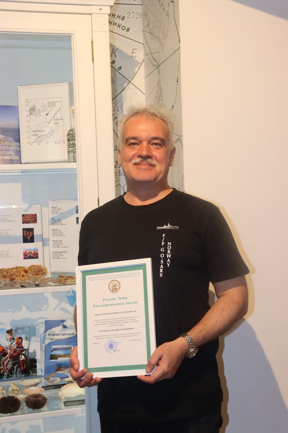 Евгению Сентябову торжественно вручили благодарственные письма от министра культуры РБ, от Общественной палаты РБ и почётную грамоту музея полярников имени В. И. Альбанова.