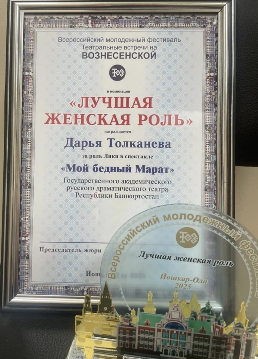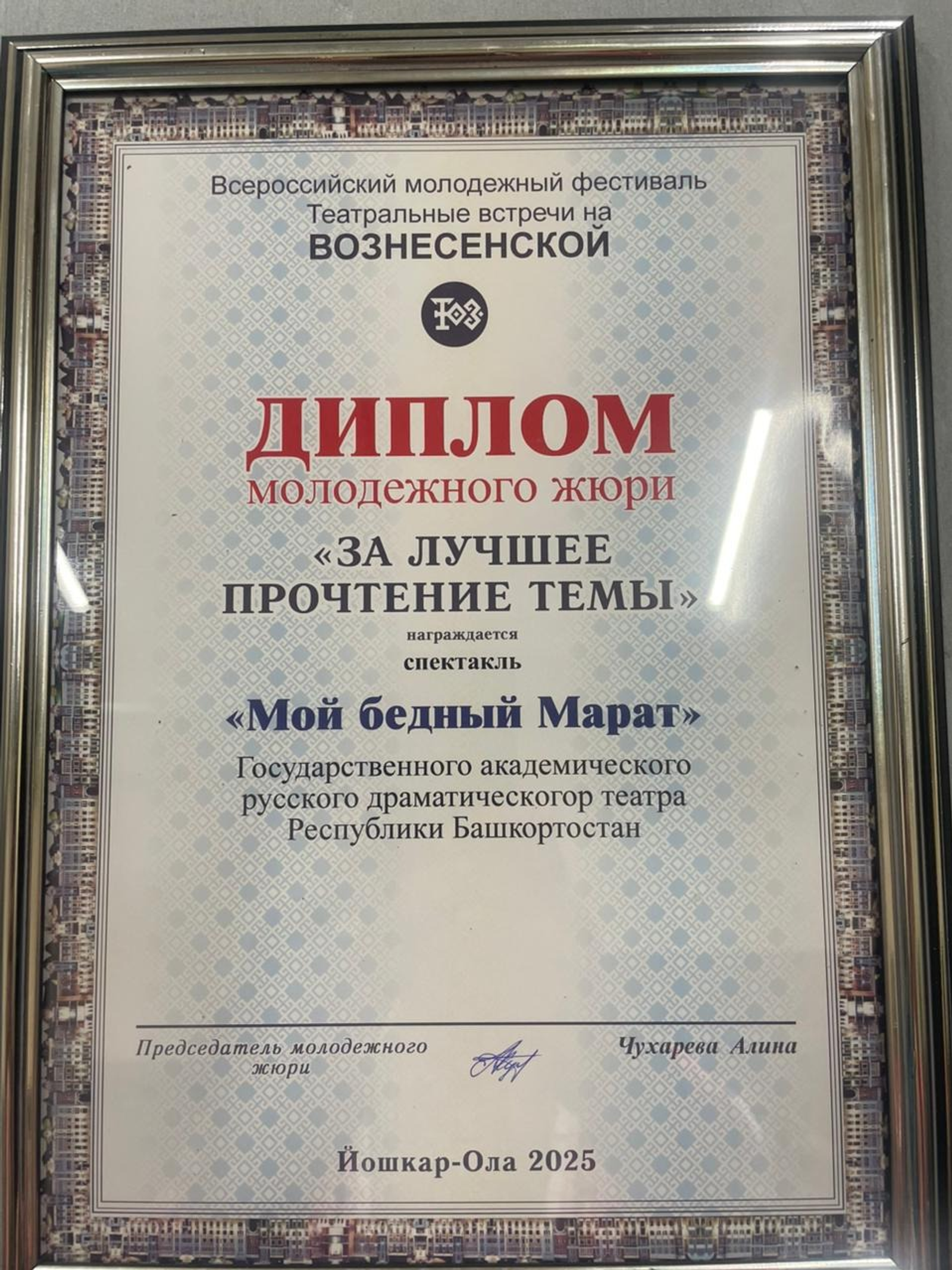 Спектакль «Мой бедный Марат» Русского драмтеатра Башкортостана удостоен диплома «За лучшее прочтение темы» на фестивале. Также актриса Дарья Толканева за роль Лики получила приз «За лучшую женскую роль».