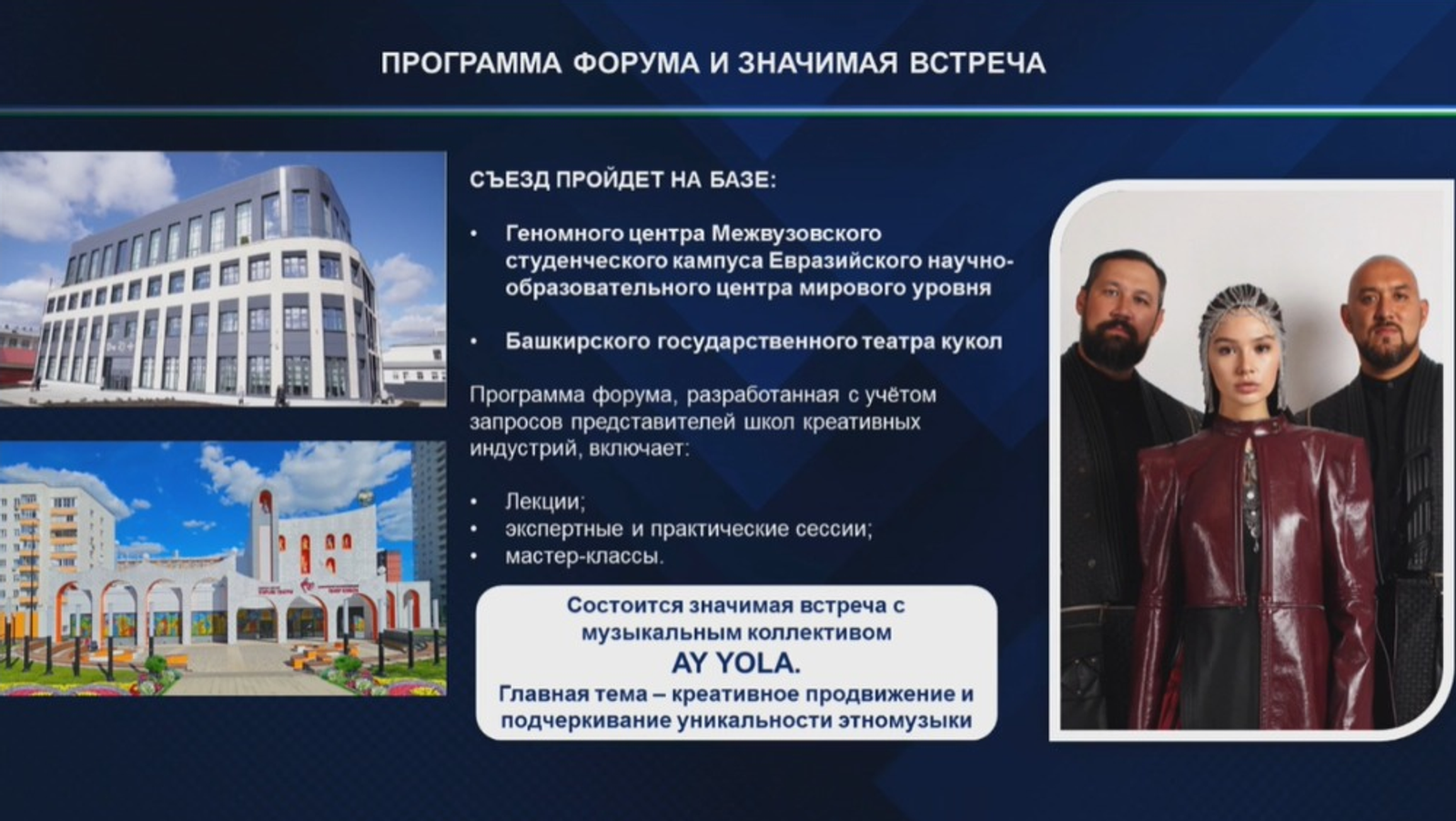 Программа форума включает лекции, экспертные и практические сессии, мастер-классы. Отдельное внимание будет уделено внедрению искусственного интеллекта в образовательную и проектную деятельность, новейших подходов к повышению цифровой грамотности педагогических коллективов и сценариев безопасного и эффективного использования технологий в проектной работе. Состоится значимая встреча с музыкальным коллективом AY YOLA. Главная тема – креативное продвижение и подчеркивание уникальности этномузыки.