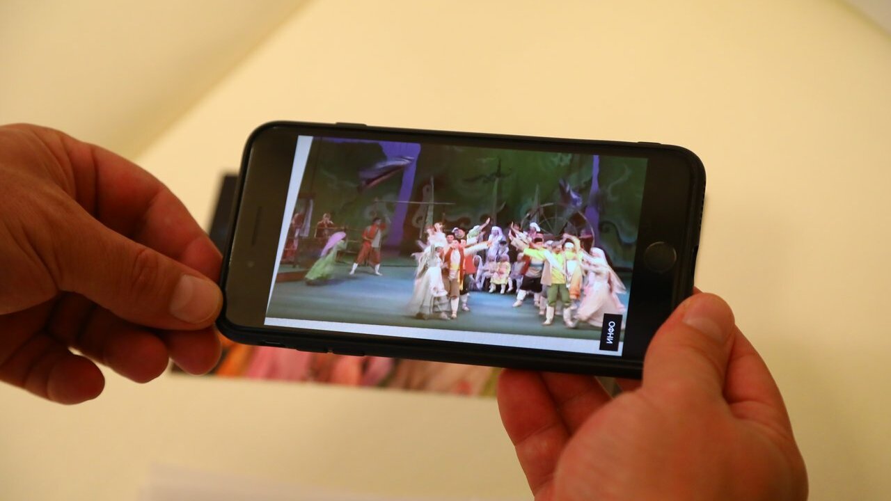 Вот посмотрите наше новое ноу-хау. Это открытка «Голубой шали», можно на ней написать поздравления и отправить. А сейчас я наведу на нее телефон и видите, что происходит? Открывается двухминутный видеоролик спектакля. Если не идти в ногу со временем, невозможно добиться интереса подрастающего поколения.