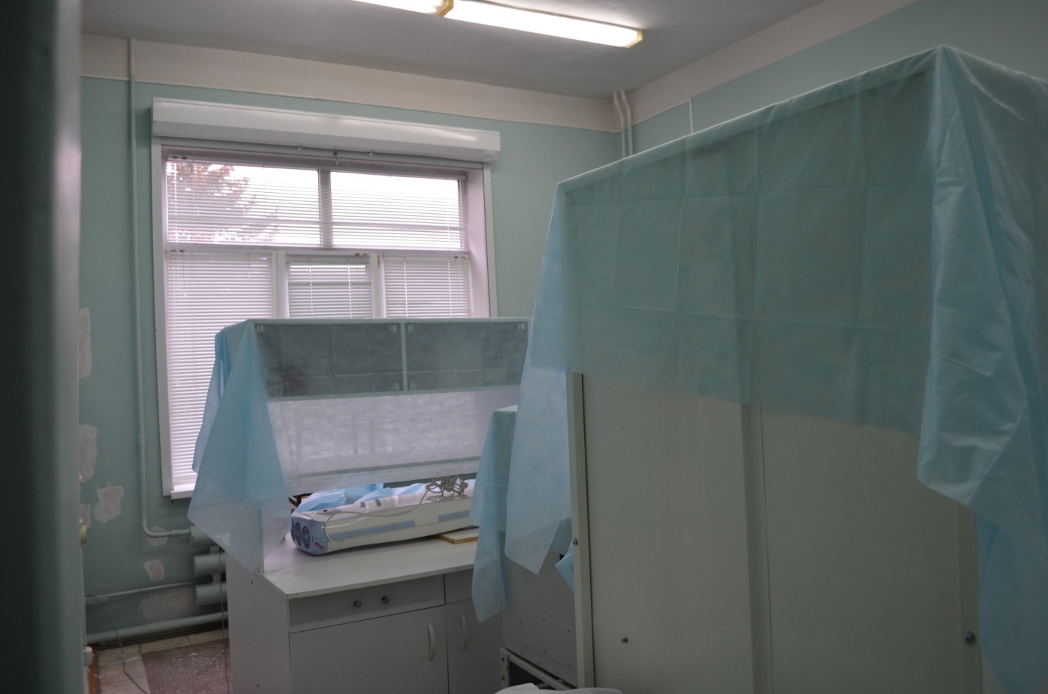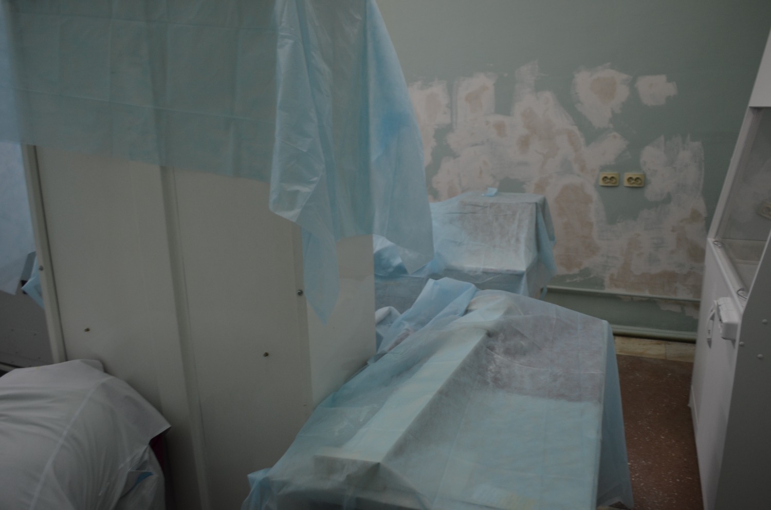 В кабинетах здания 1939 года постройки, расположенного на Индустриальном шоссе, 42, сейчас полным ходом идет ремонт. В глаза бросились обшарпанные стены, замазанные шпаклевкой, закрытая техника и мебель. Лаборатория здесь находится в стадии реорганизации в рамках проекта Минздрава РБ. Кабинеты, где стояла техника, займут врачи и будут принимать пациентов.
