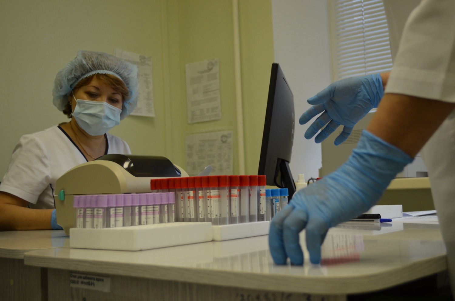 Утро вторника, 2 ноября, началось со сдачи общего анализа крови в поликлинике №1, расположенной на улице Цюрупы, 3. Терапевт спросила, есть ли жалобы, измерила давление, сатурацию и выдала направление на анализ. В процедурном кабинете данные занесли в базу, распечатали специальный штрих-код, который приклеили на пробирку. На штрих-коде указывается медорганизация, где произведен забор крови, фамилия и инициалы пациента, какое исследование требуется произвести.